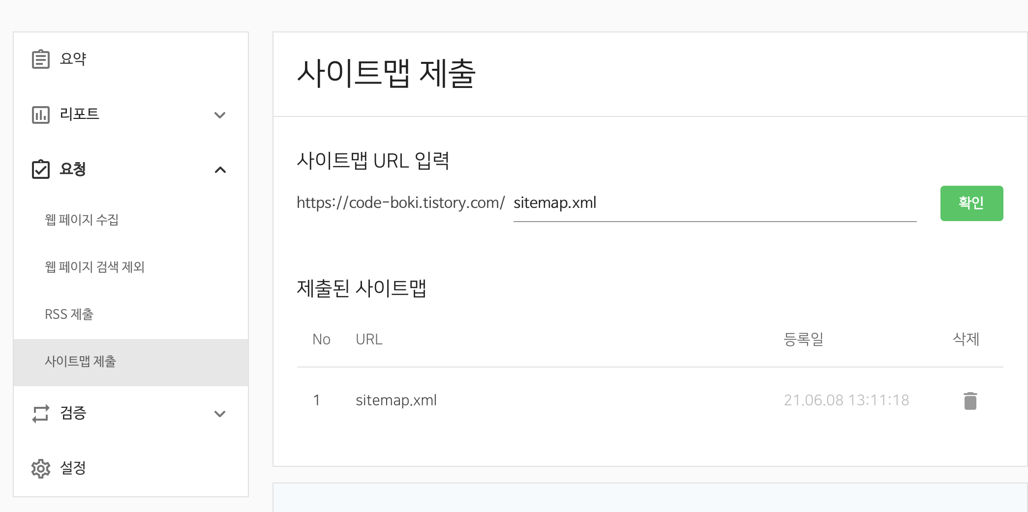 여기에서는 자기블로그의 주소를 포함해서 /sitemap.xml을 입력하고 확인을 눌러줍니다.(최신 티스토리의 경우에는 사이트맵을 만들어줍니다. 예전 티스토리는 직접 만들었어야됐음)