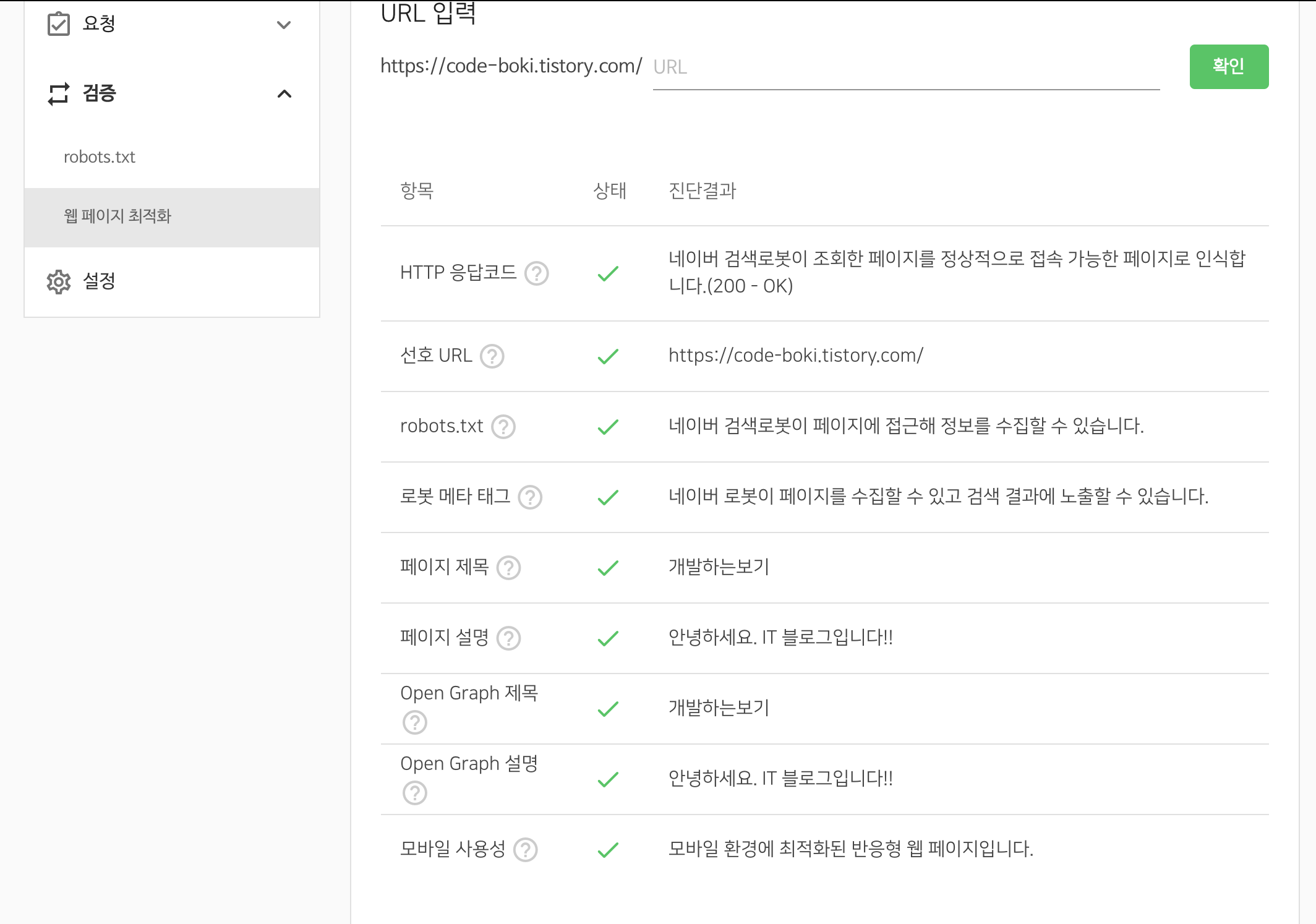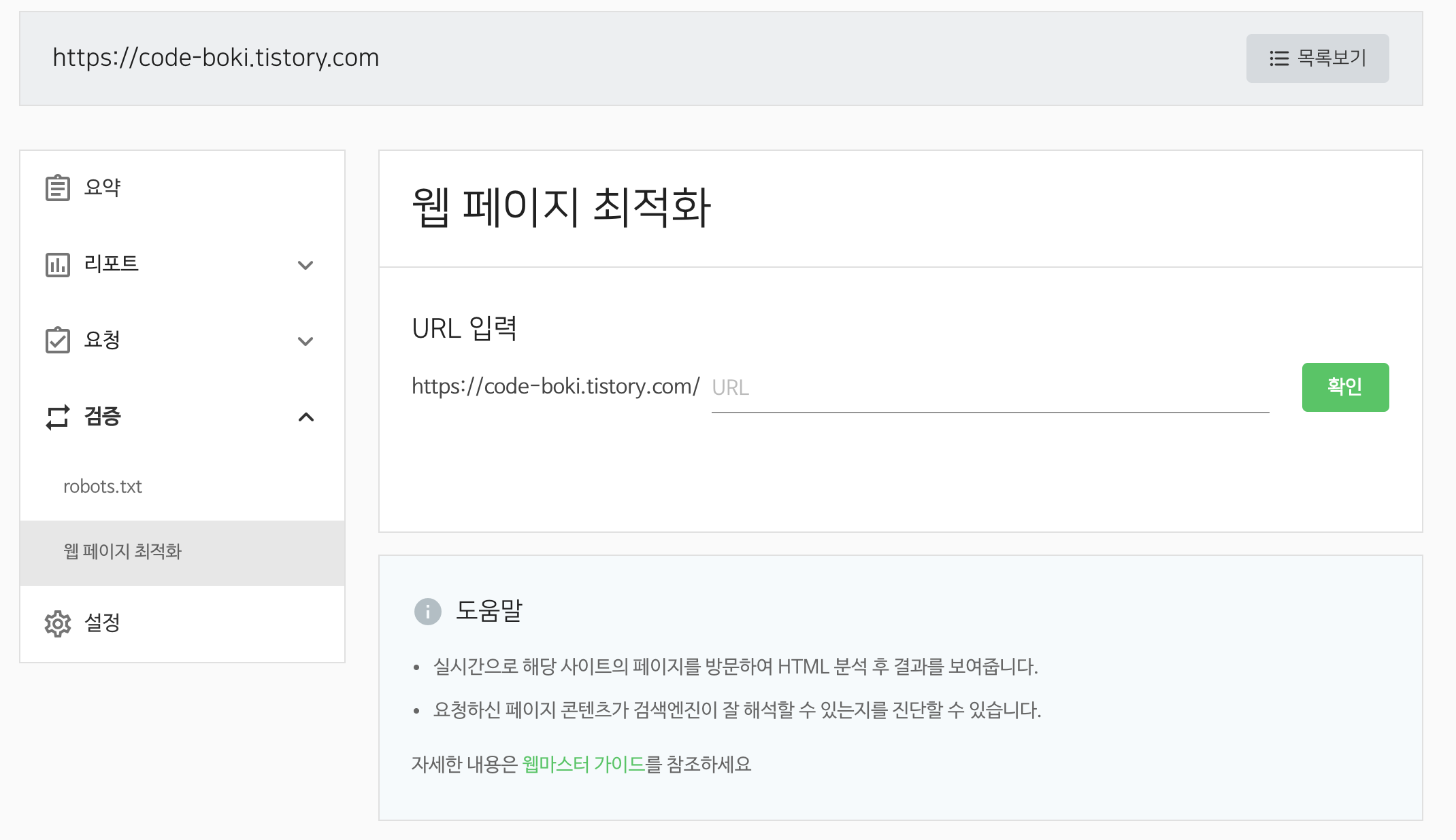6. 검증->웹 페이지 최적화를 눌러서 기본 주소에서 확인을 눌러줍니다.