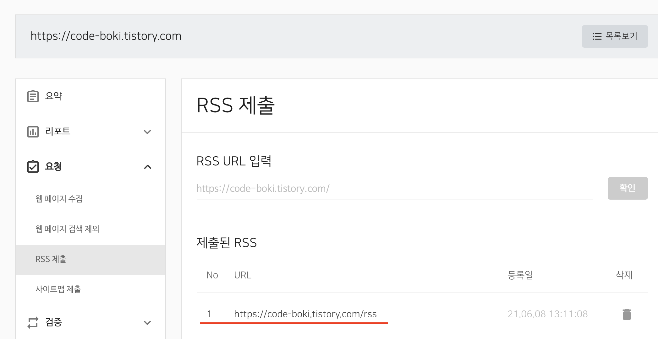 여기에서 본인의 티스토리 블로그 주소에서 /rss를 추가한 주소를 입력하고 제출 확인을 해줍니다