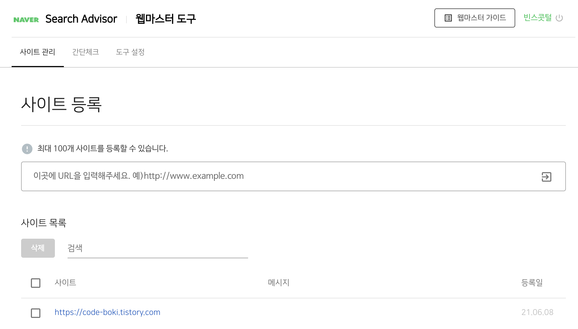 회원가입을 하고 상위 메뉴의 웹 마스터 도구를 클릭해줍니다
