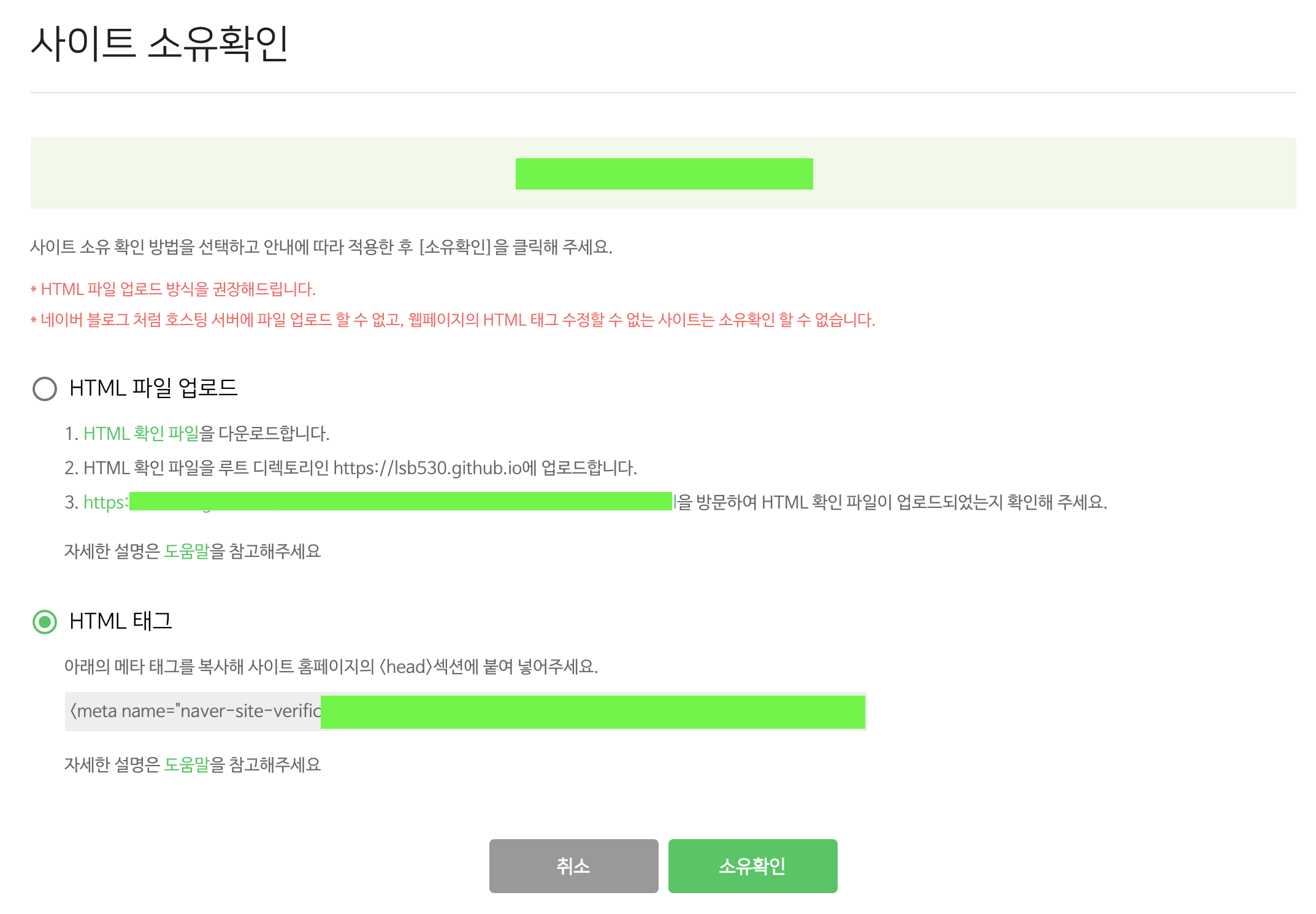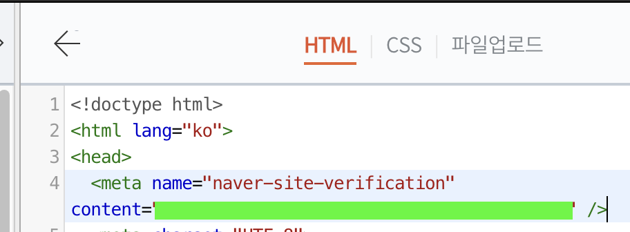 html 파일 업로드와 html 태그가 있는데 아래에 있는 html 태그를 눌러주시고 아래의 메타 태그를 복사해줍니다.