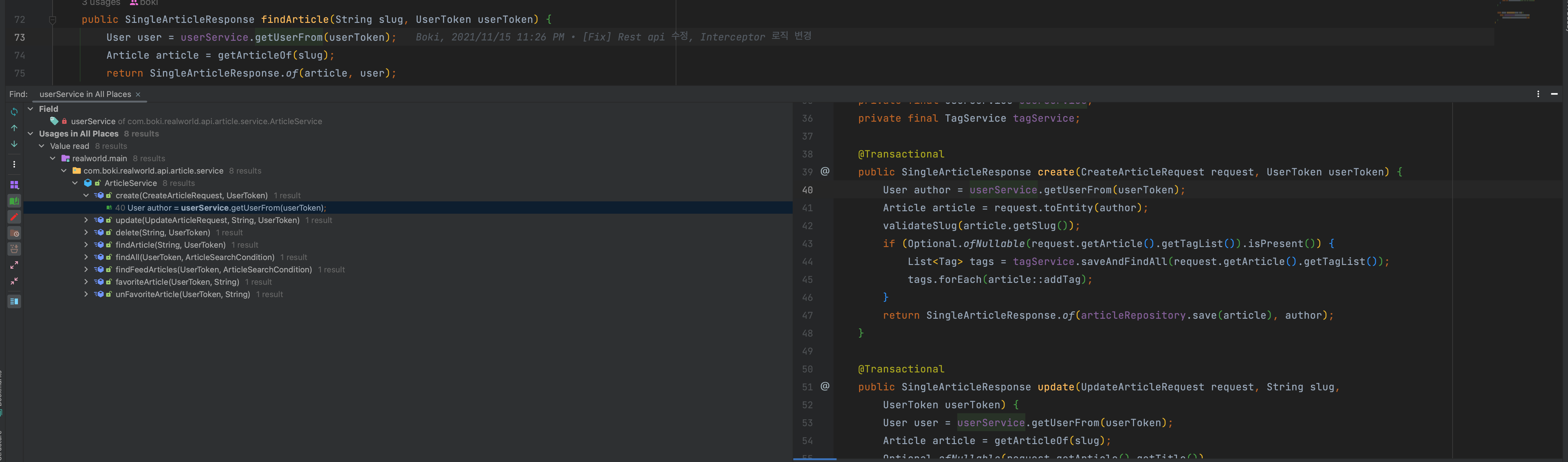 getUserFrom 메서드에서 단축키를 사용한 결과