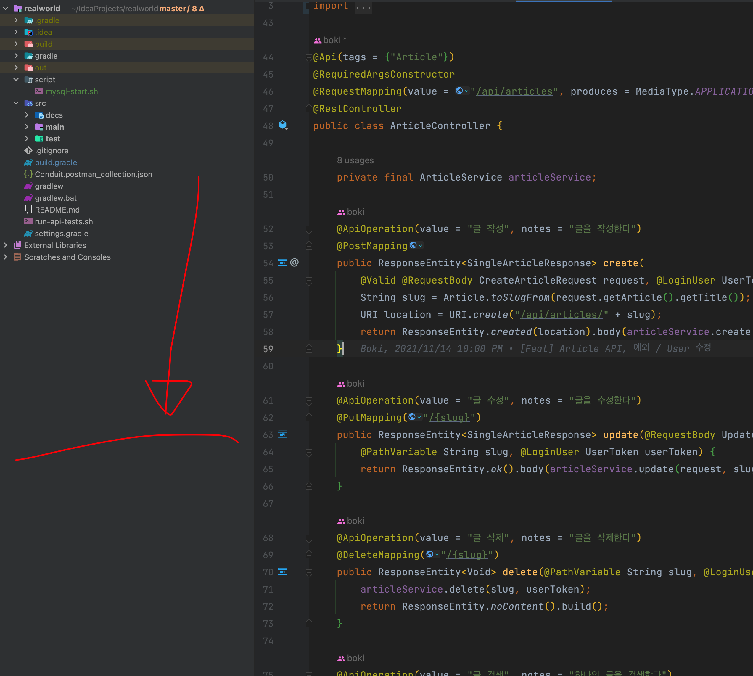 - 구조(structure) 보기: Cmd + 7 (위와 비슷하다. 하지만 더 강력하다. 프로젝트 구조도 볼 수 있고 메서드 단위로 점프 뛰며 이동할 수 도 있다)