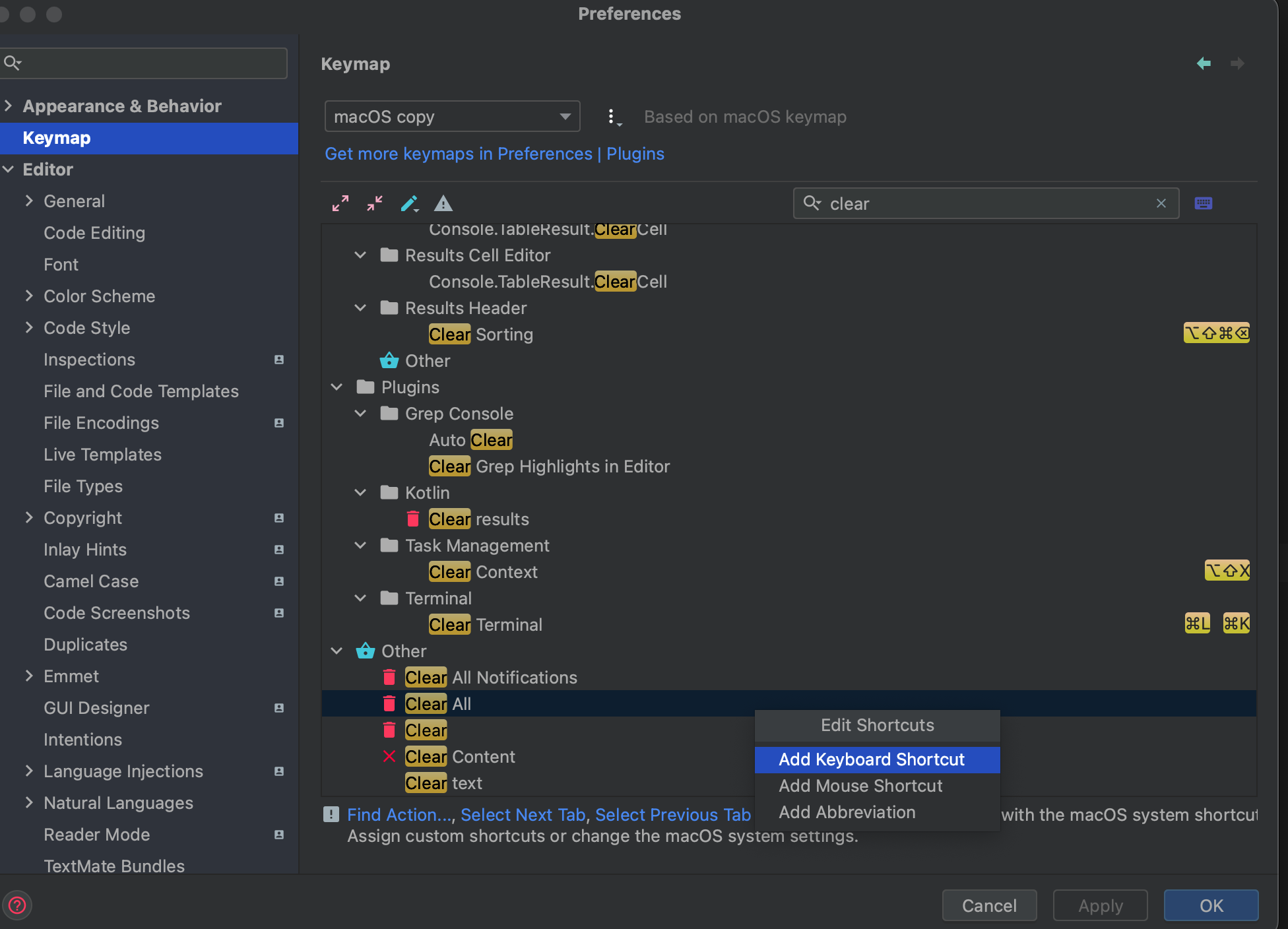 - 실행 중 탭(Run): cmd + 4 / Keymap에서 clear all 찾아서 ctrl + cmd + del로 등록해놓고 사용해놓음 유용함