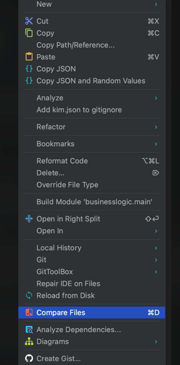 이후에 프로젝트 파일에서 두 파일을 선택해서 Cmd + D 혹은 마우스 우클릭에서 compare files를 눌러보자