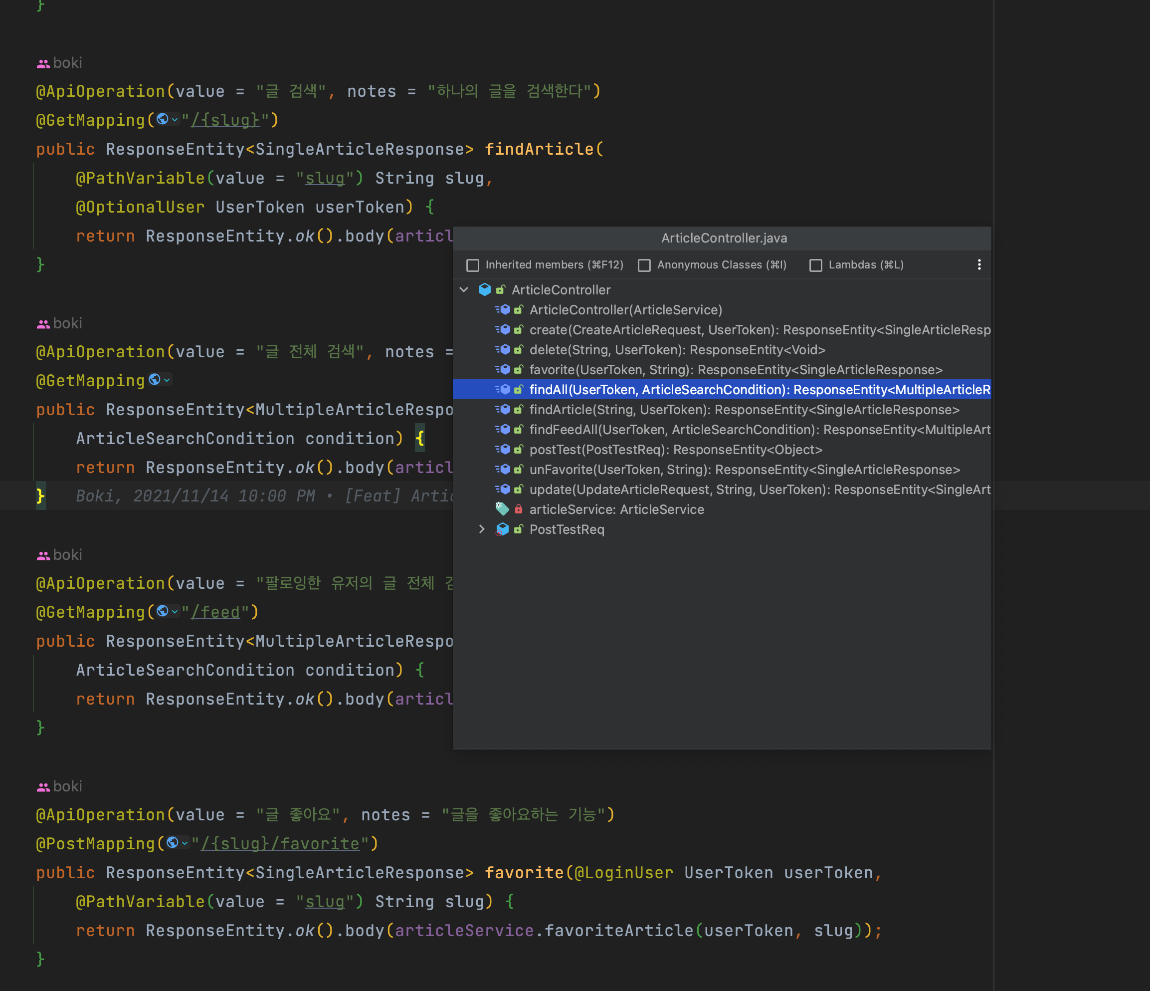 => 로직이 복잡할때 모든 메서드를 줄여놓고 cmd + 7으로 메서드를 찾아가서 작업하면 눈도 머리도 안피곤함!