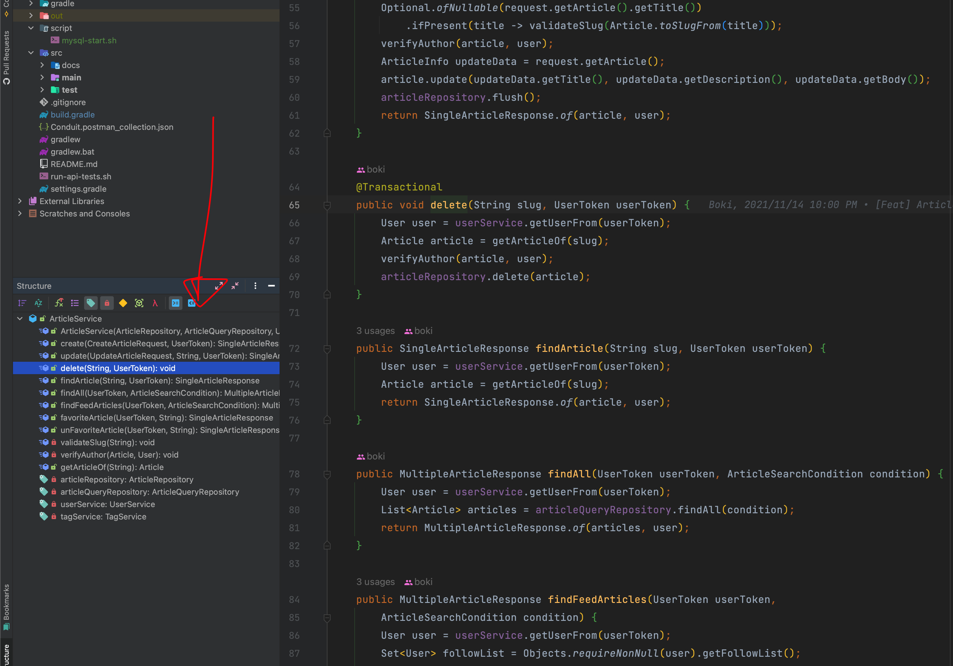 - 구조(structure) 보기: Cmd + 7 (위와 비슷하다. 하지만 더 강력하다. 프로젝트 구조도 볼 수 있고 메서드 단위로 점프 뛰며 이동할 수 도 있다)