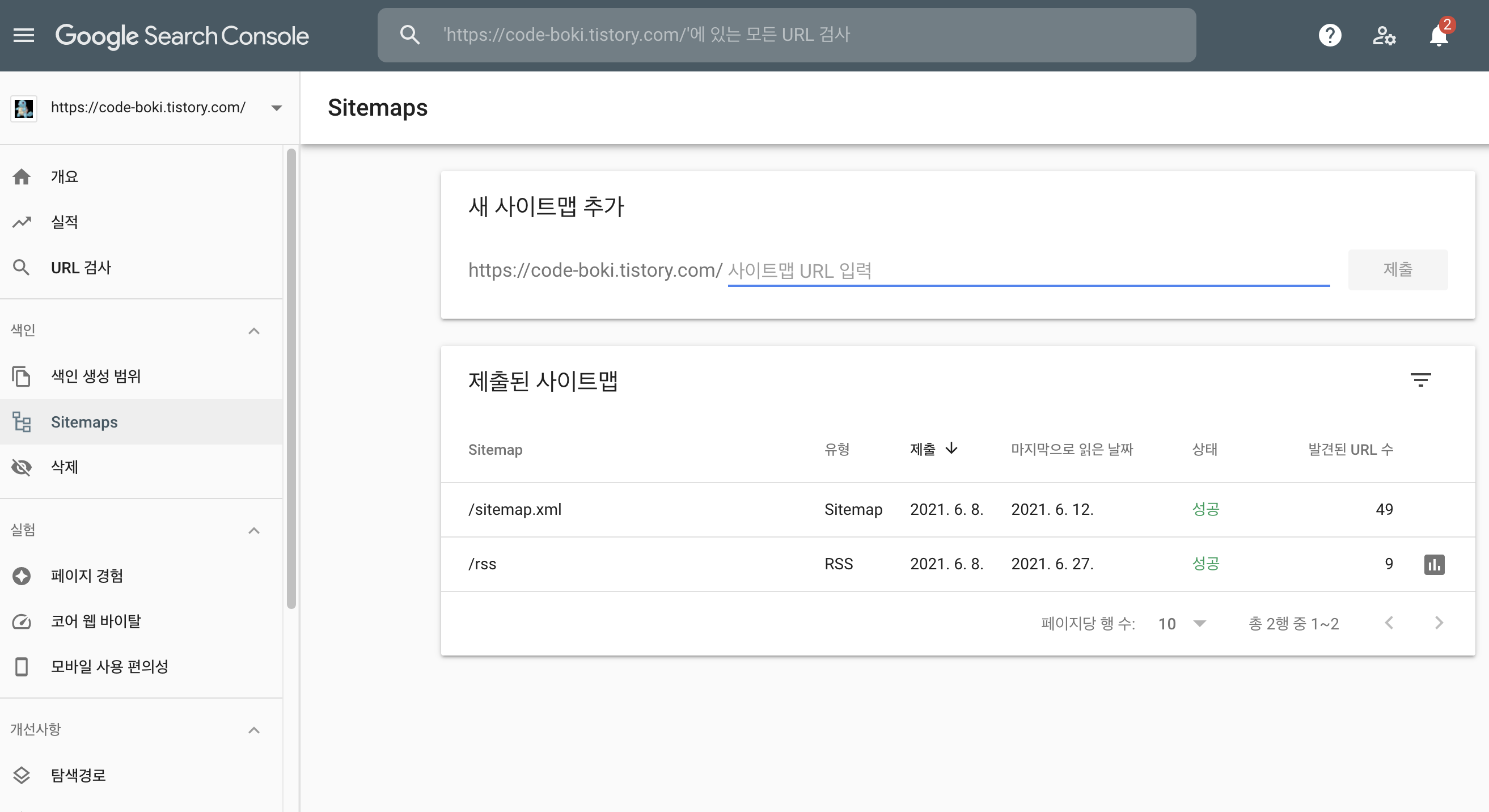 /sitemap.xml과 /rss를 두개 제출해주시면 됩니다.