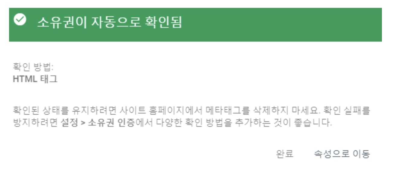 적용 후 구글 웹마스터 도구에서 완료 후 확인하시면 소유 확인 되었다는 문구를 보실 수 있습니다.