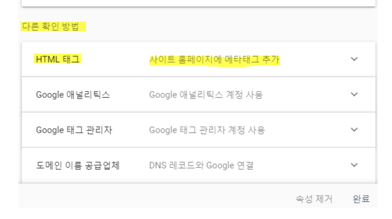 권장 방법이 아닌, 드래그를 조금더 밑으로 해서 하단의 다른 방법 확인 HTML 태그를 클릭하시고 meta 태그를 복사해줍니다.