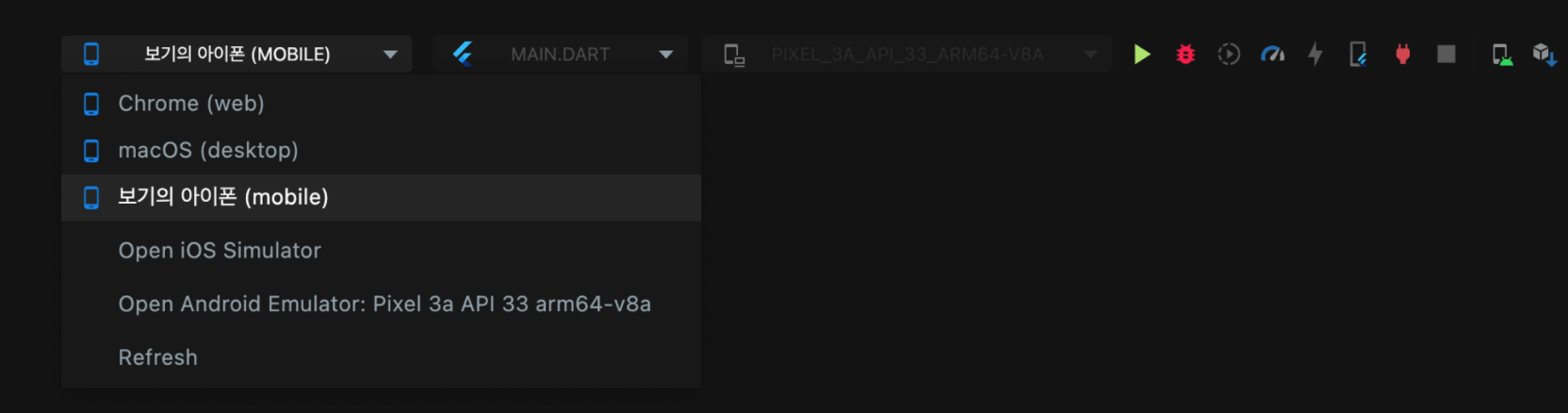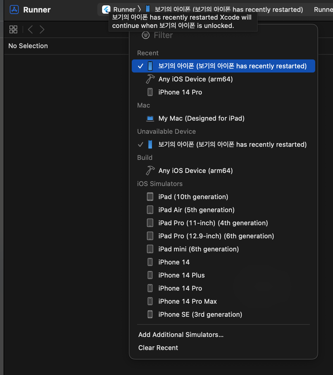 그 다음 왼쪽 위에 "Runner > iPhone xx" 부분을 클릭한다