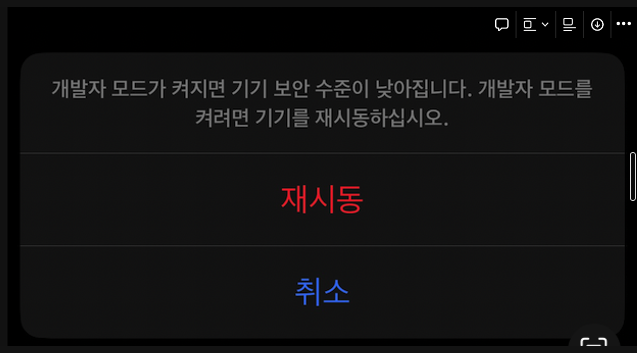 아래의 개발자 도구를 끔→켬으로 바꿔준다 (재부팅)