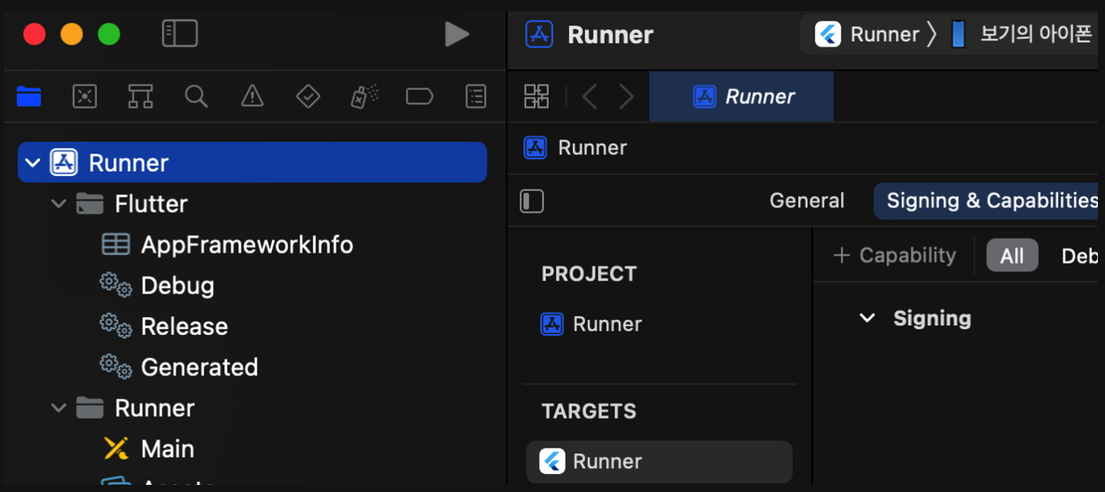 그 후에 좌측의 Runner 탭을 누르고 Signing & Capabilities 탭으로 간다