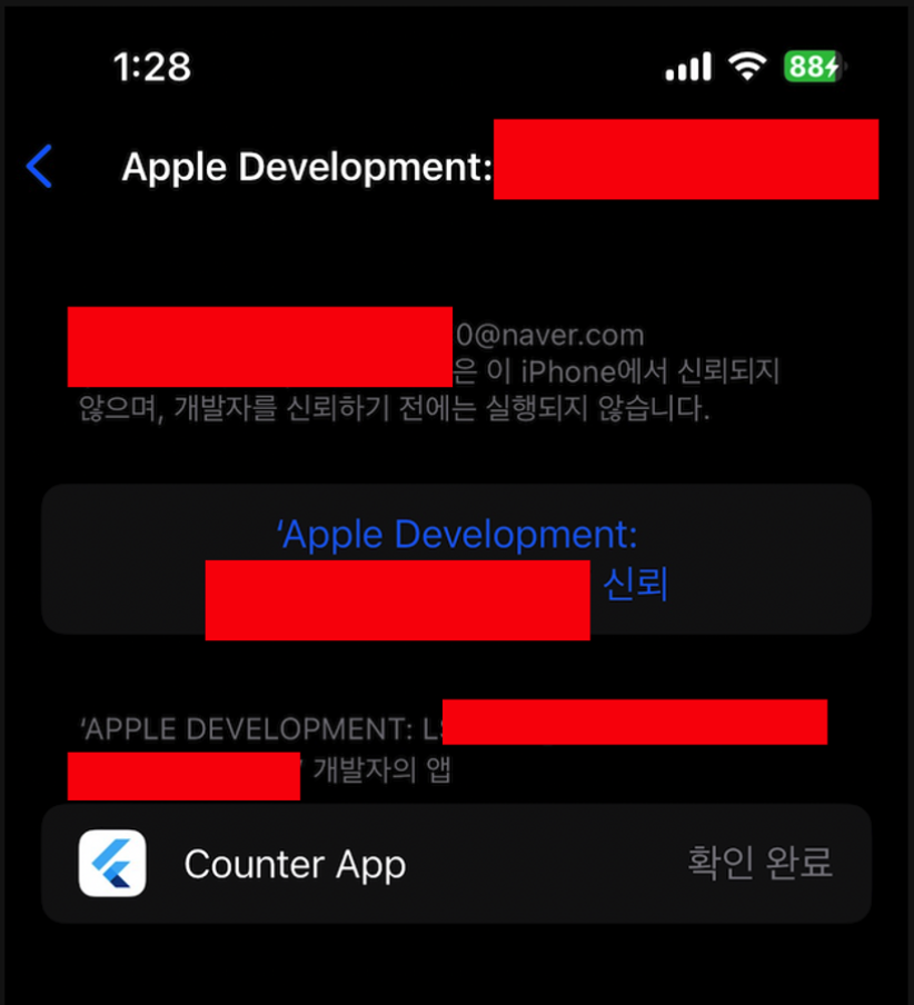 위에 파란색 ‘Apple Development: ~~~’ 신뢰를 누른다