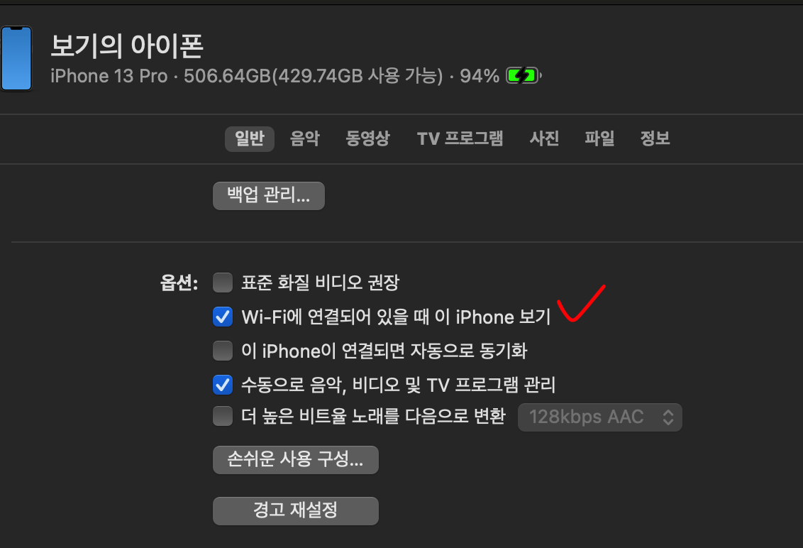 연결된 상태에서 Finder의 일반 탭에서 아래로 내려서