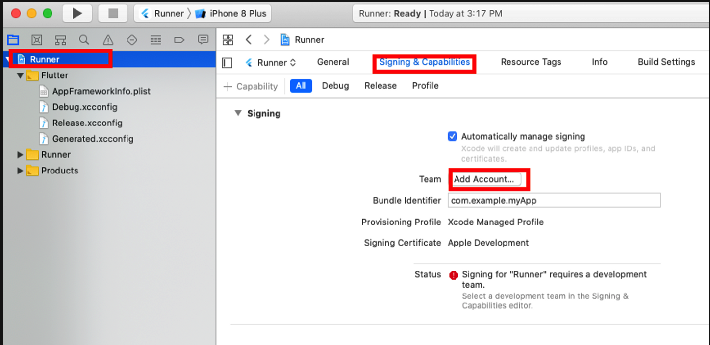 그 후에 좌측의 Runner 탭을 누르고 Signing & Capabilities 탭으로 간다