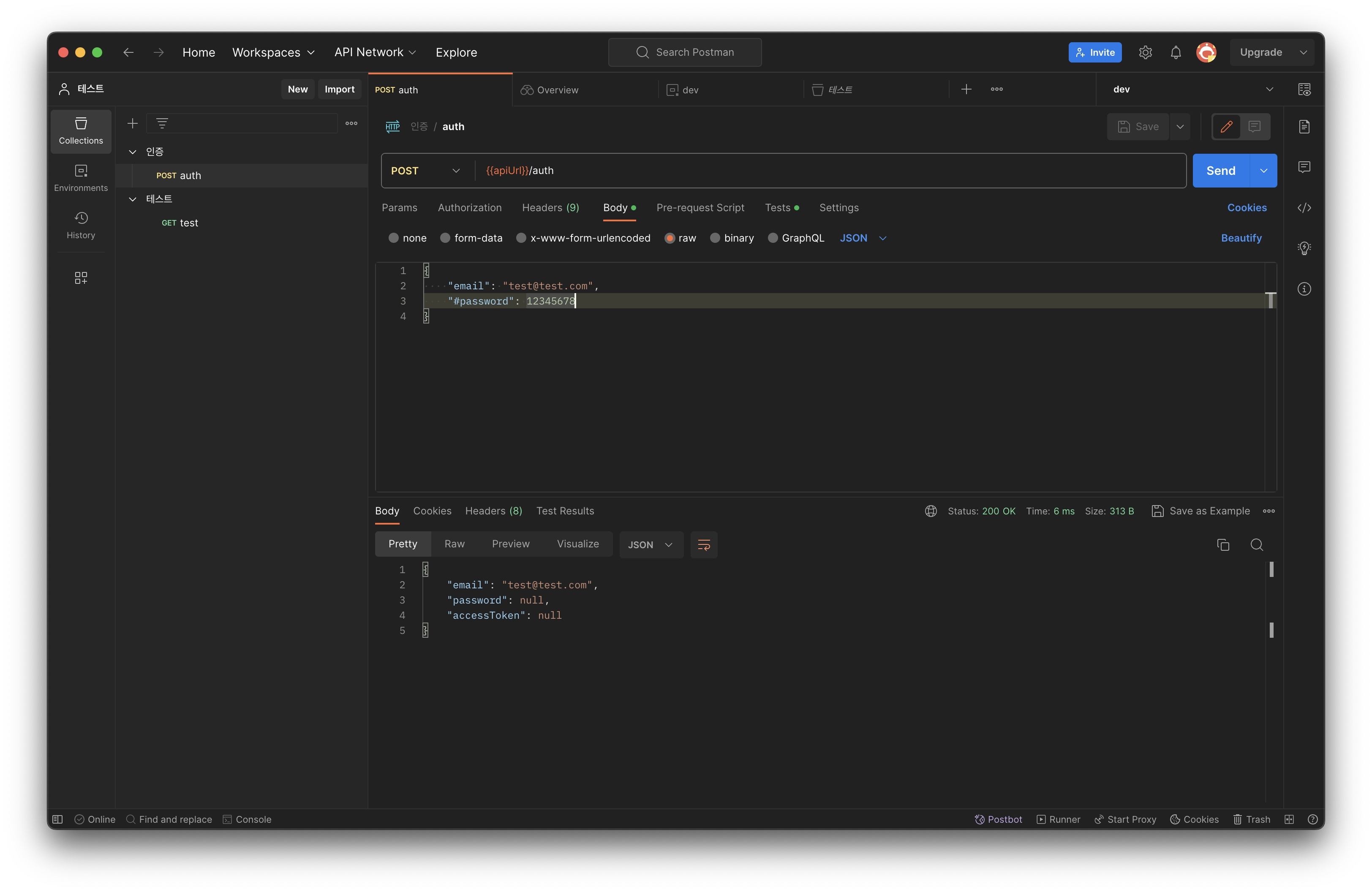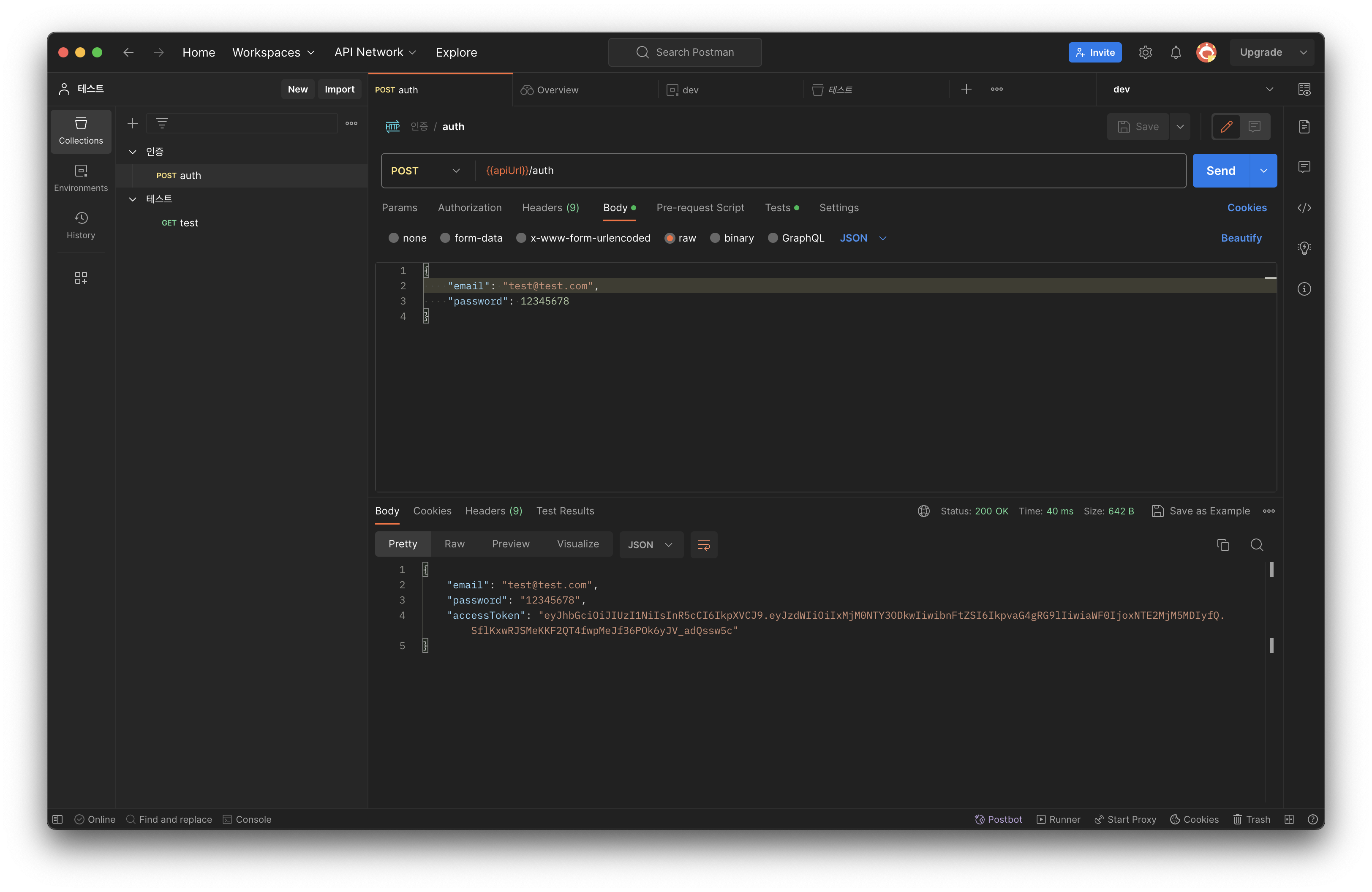 서버에서 응답 헤더와 바디에 둘다 accessToken을 내려 주었으니, 클라이언트에서도 받아서 postman 환경 변수에 저장해보자