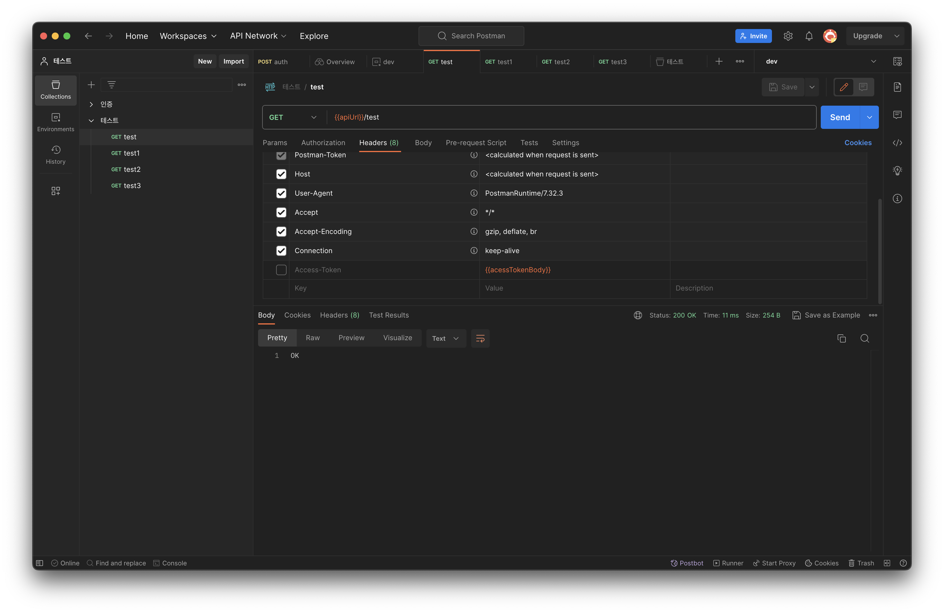 3. 단일 request가 아닌, collection 요청 헤더에 전역으로 추가