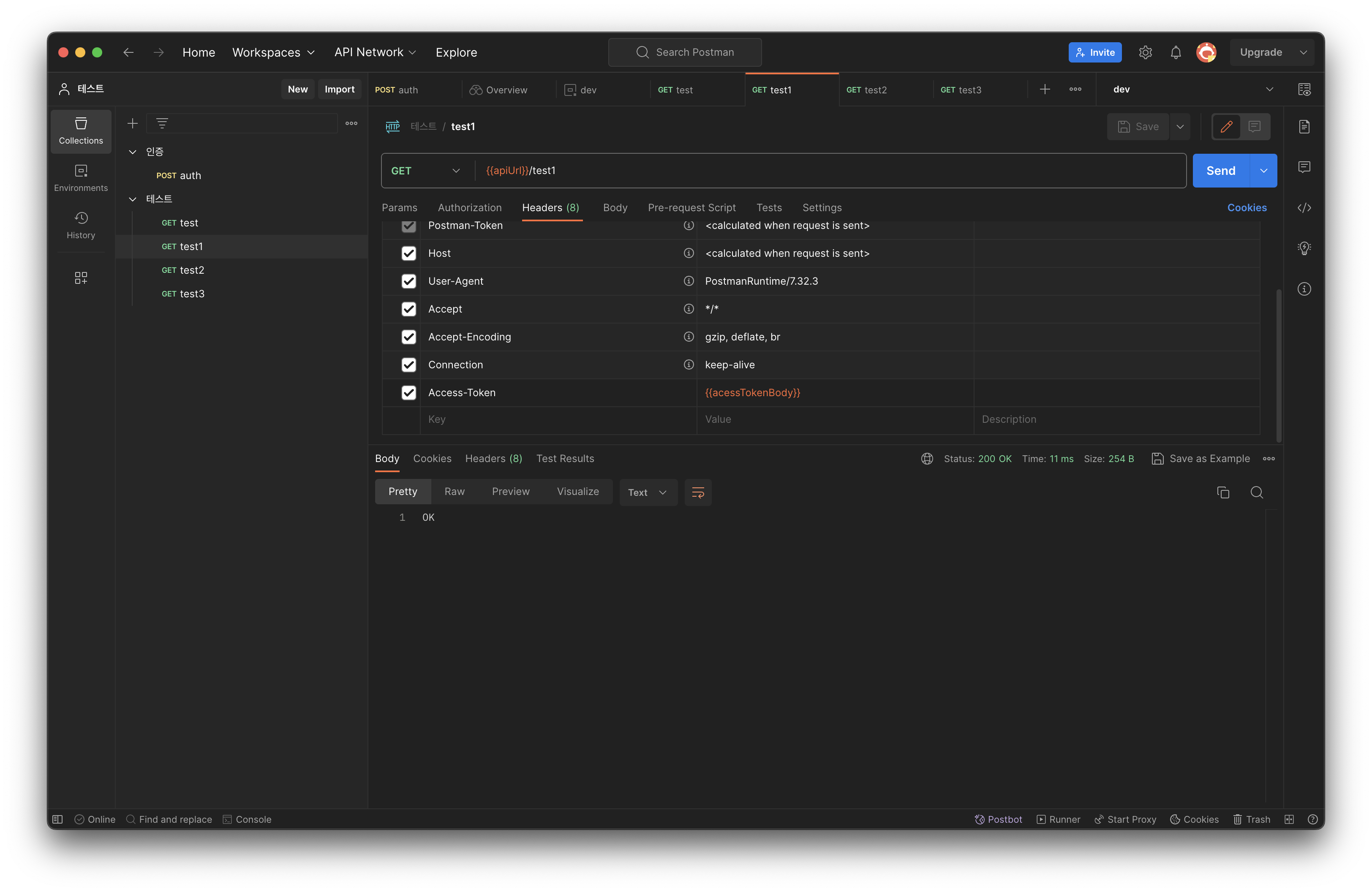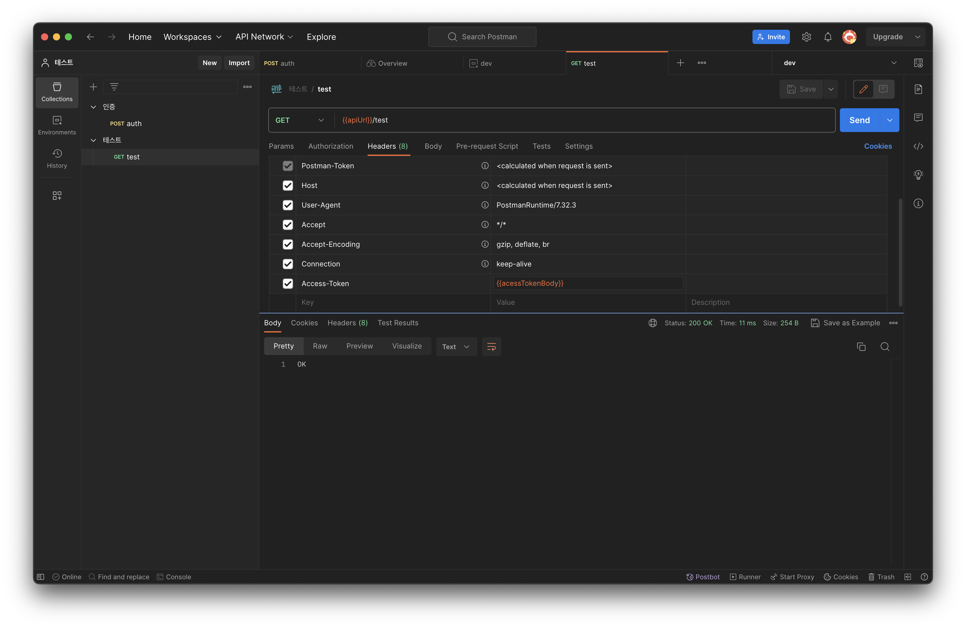 테스트라는 Collection(API 요청 집합)에서는 헤더에 Access-Token을 자동으로 넣어주고 싶다