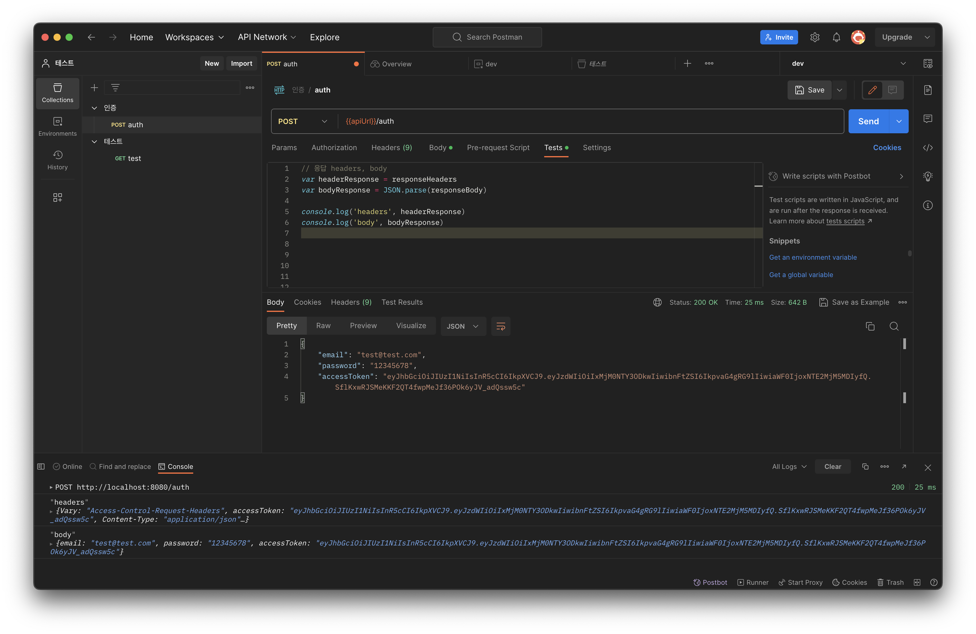 2. response응답에서 headers, body를 뽑아서 환경변수로 저장