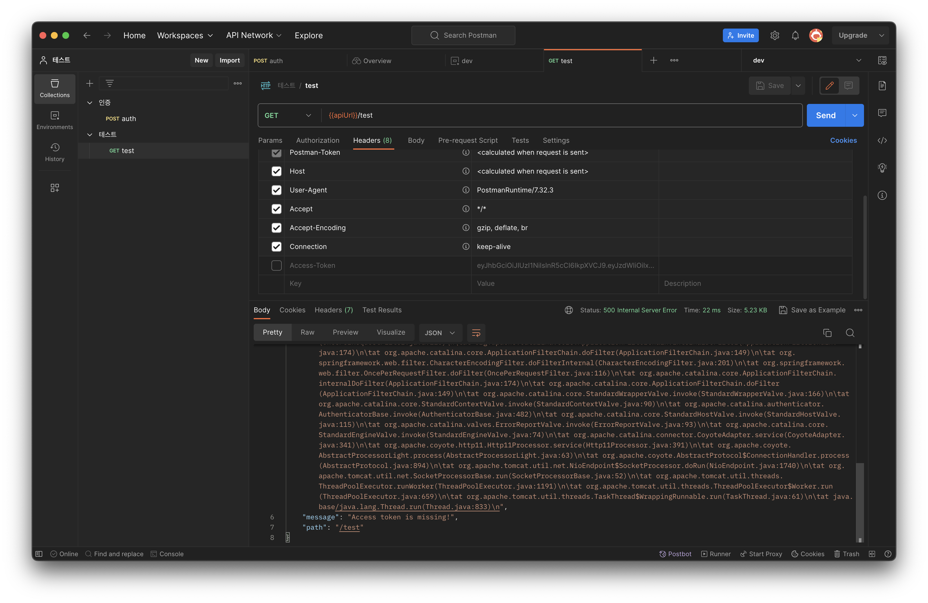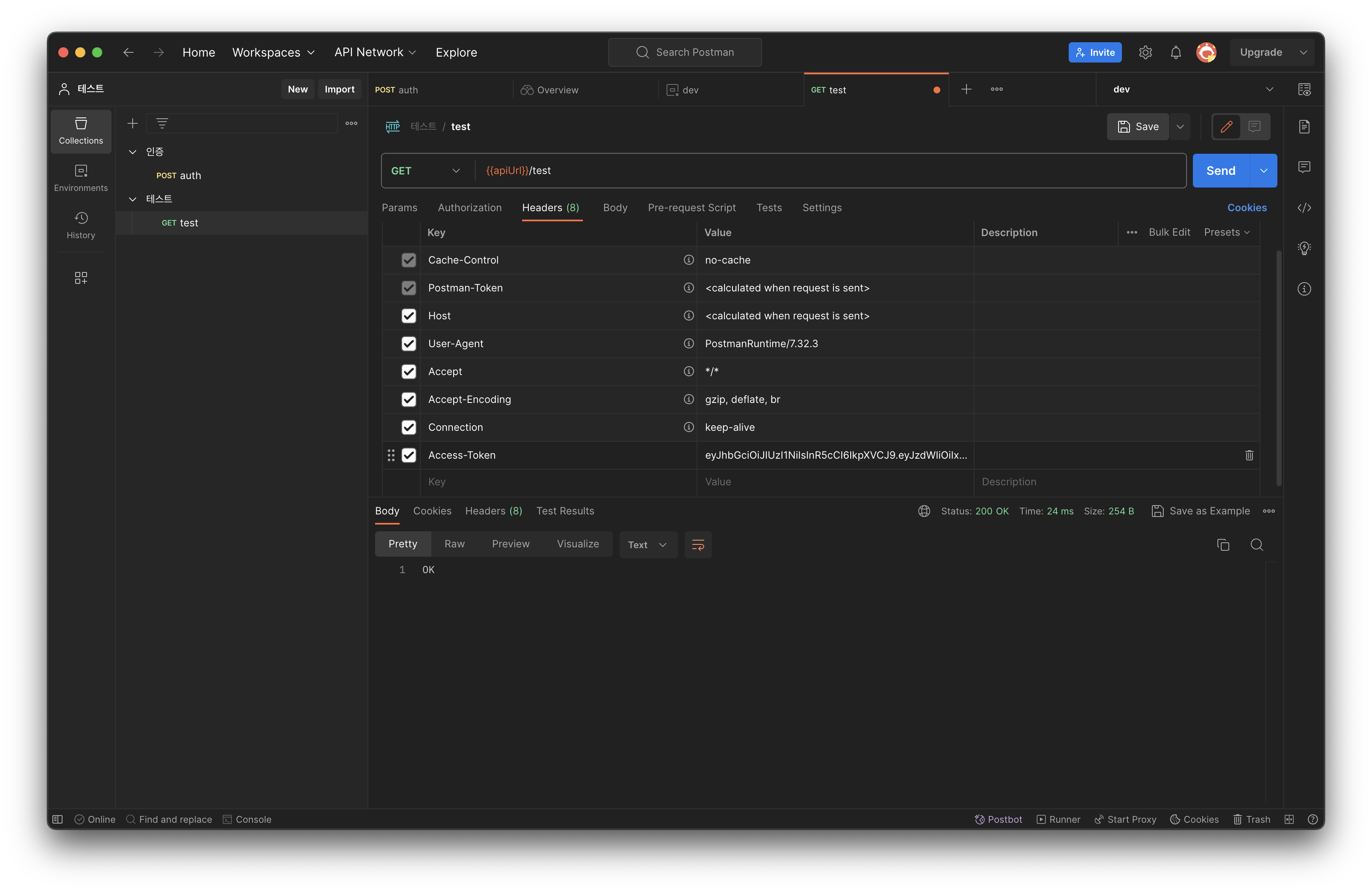 테스트라는 Collection(API 요청 집합)에서는 헤더에 Access-Token을 자동으로 넣어주고 싶다