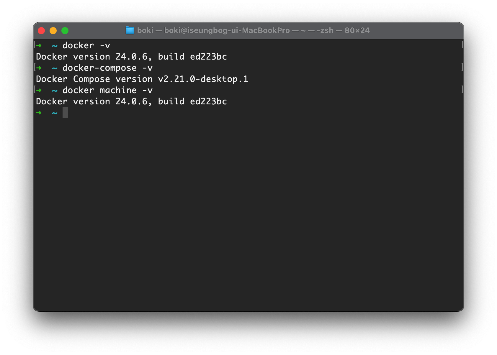그리고 터미널을 열어서 docker, docker-compose, machine의 버전을 출력해보자
