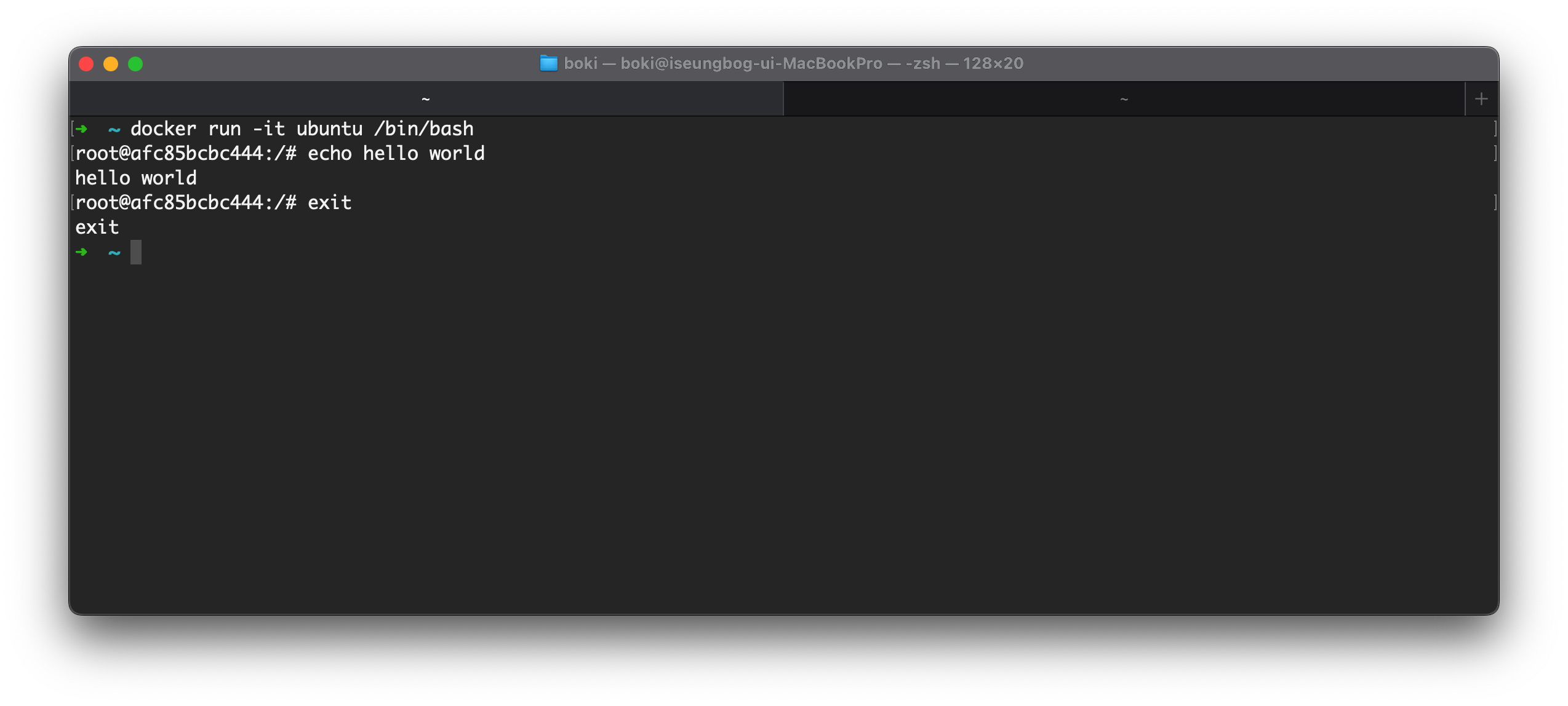 터미널의 새로운 탭을 열어서(cmd + T) docker ps -a 명령어를 입력해보면 컨테이너가 실행 중인 것(UP STATUS)을 볼 수 있다