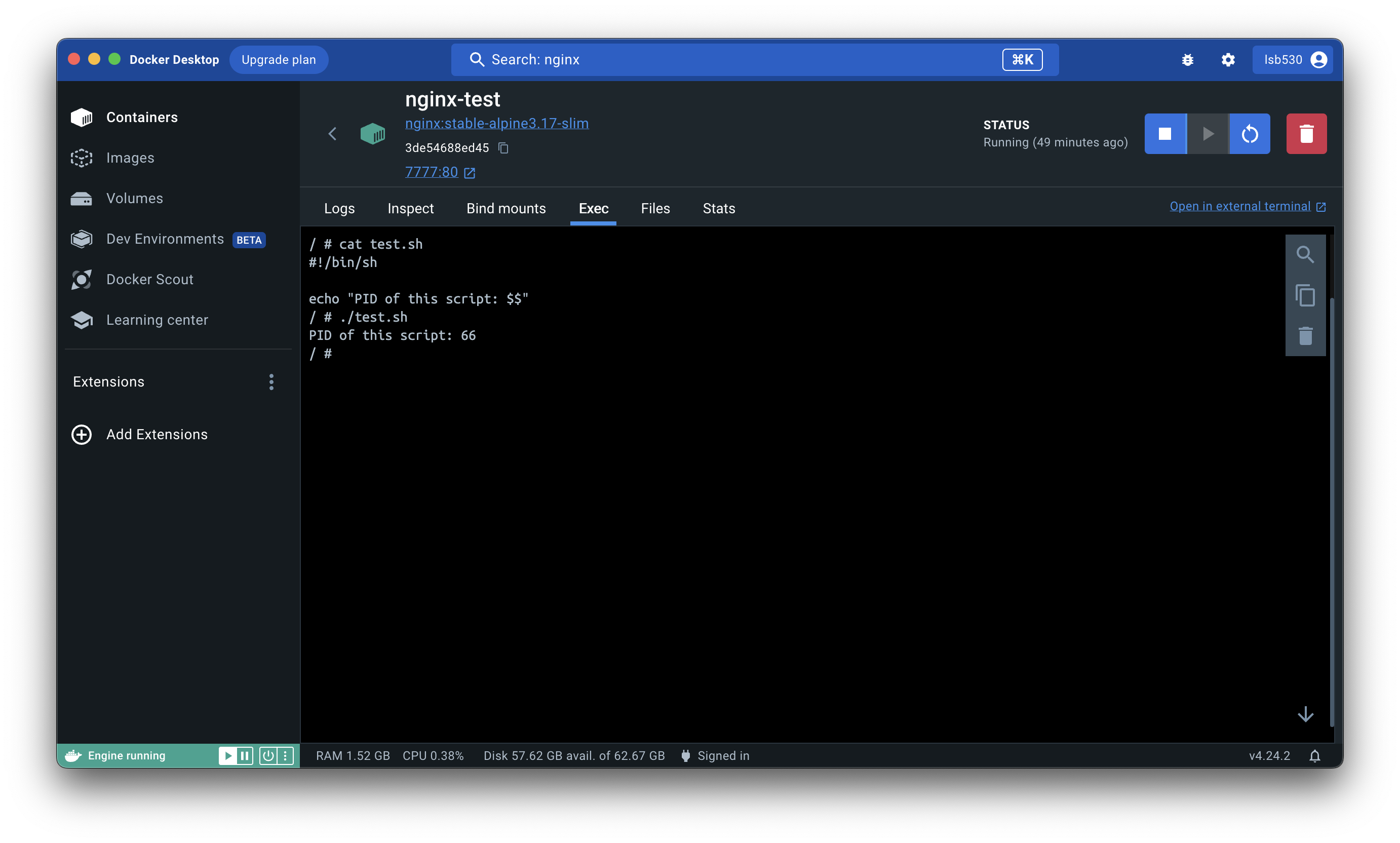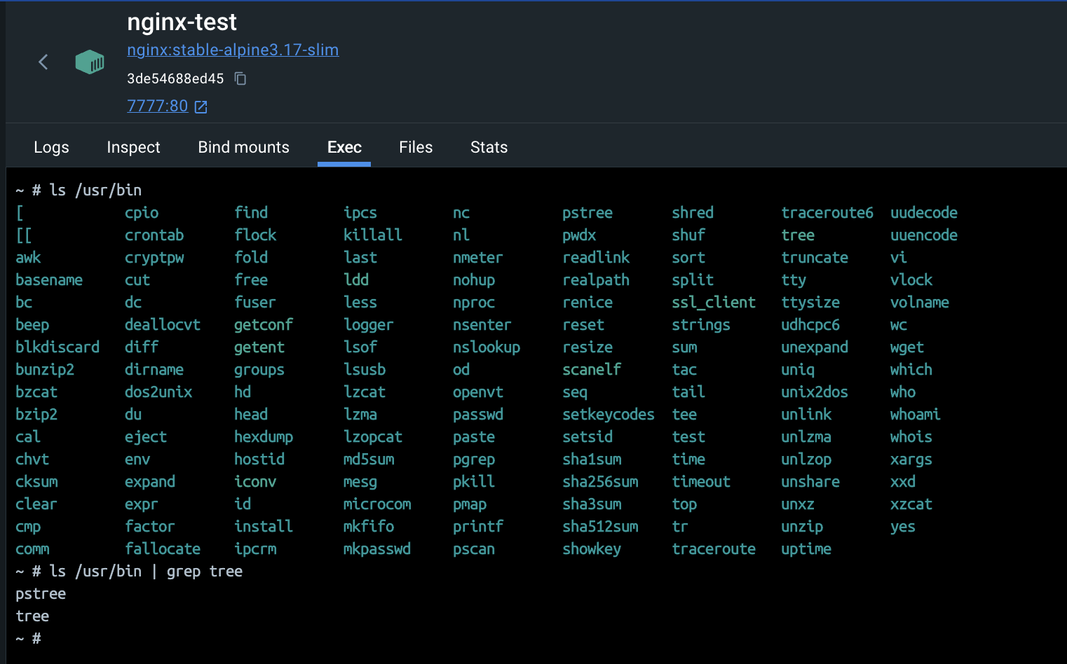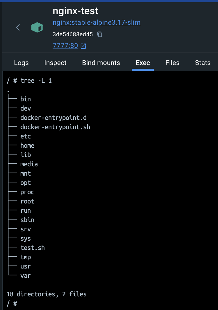 이번에는 Exec 탭을 클릭해보자 이 컨테이너의 내부로 들어와서 명령어들을 실행할 수 있게 된다