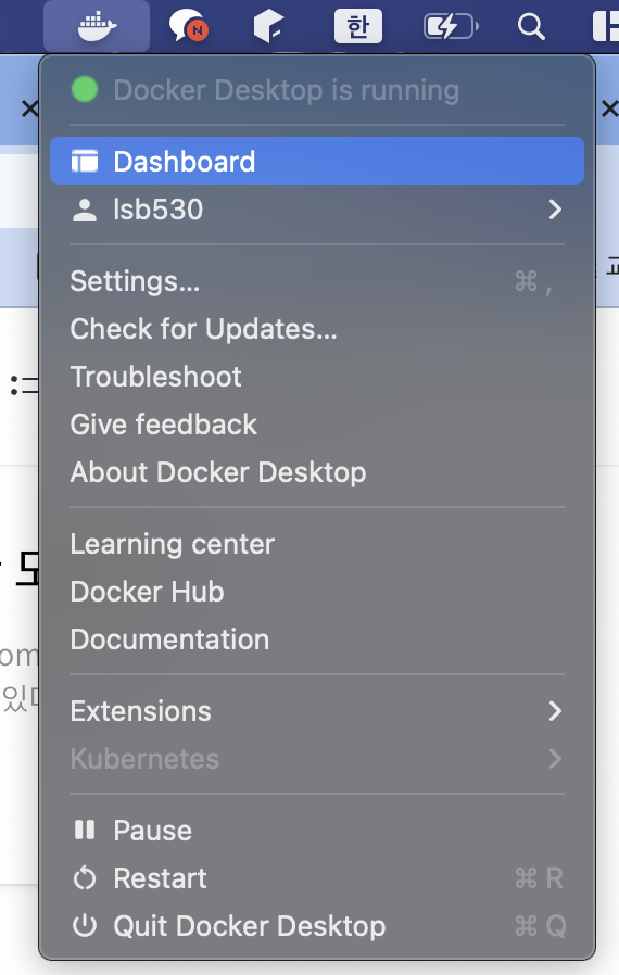 Docker Desktop을 실행하자 맥을 사용중이라면 메뉴 도구를 한번 확인해보자