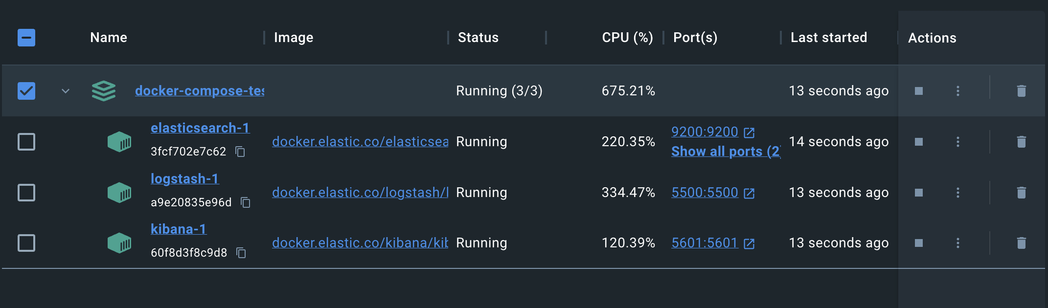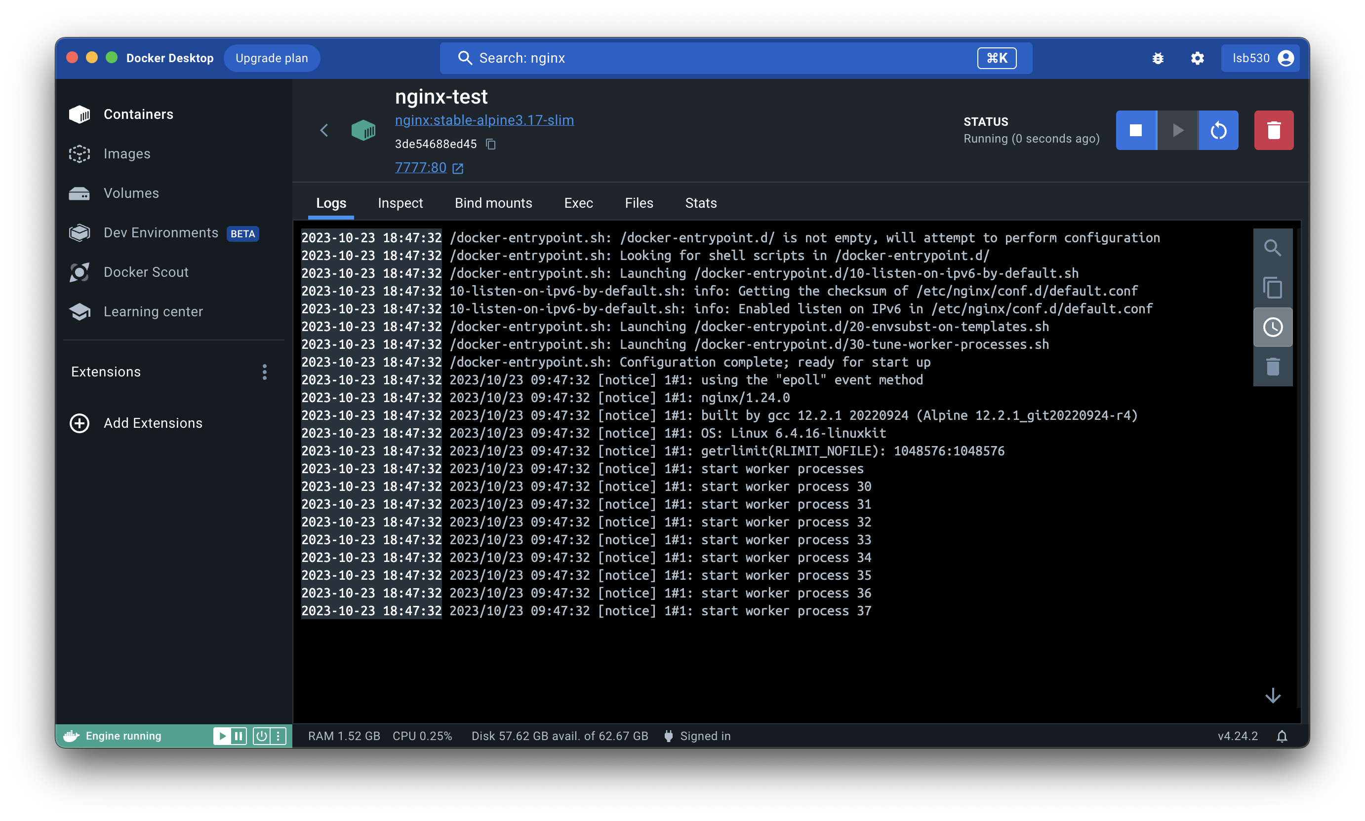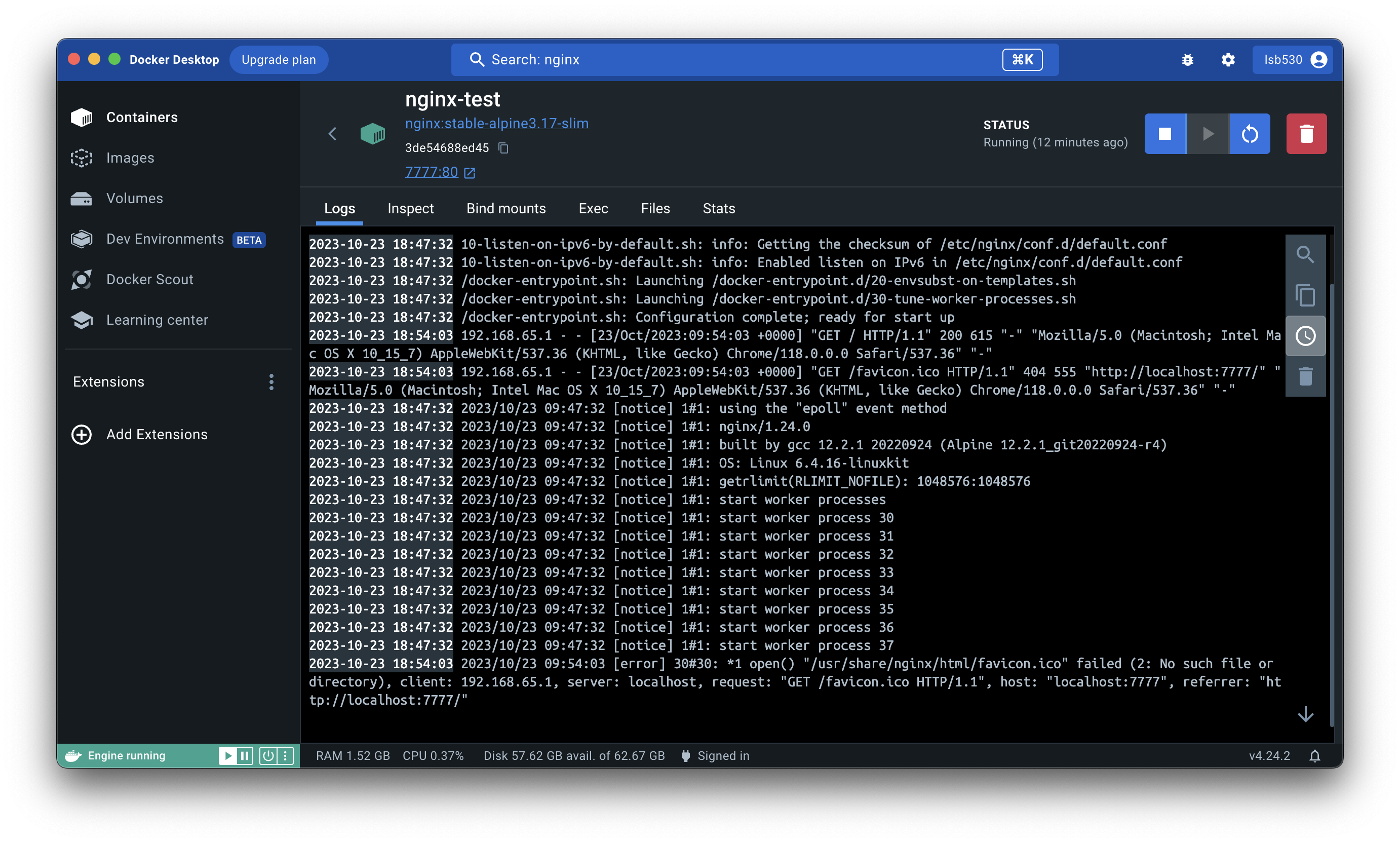 Logs탭은 컨테이너가 올라가면서 출력한 내부의 로그를 띄워준다