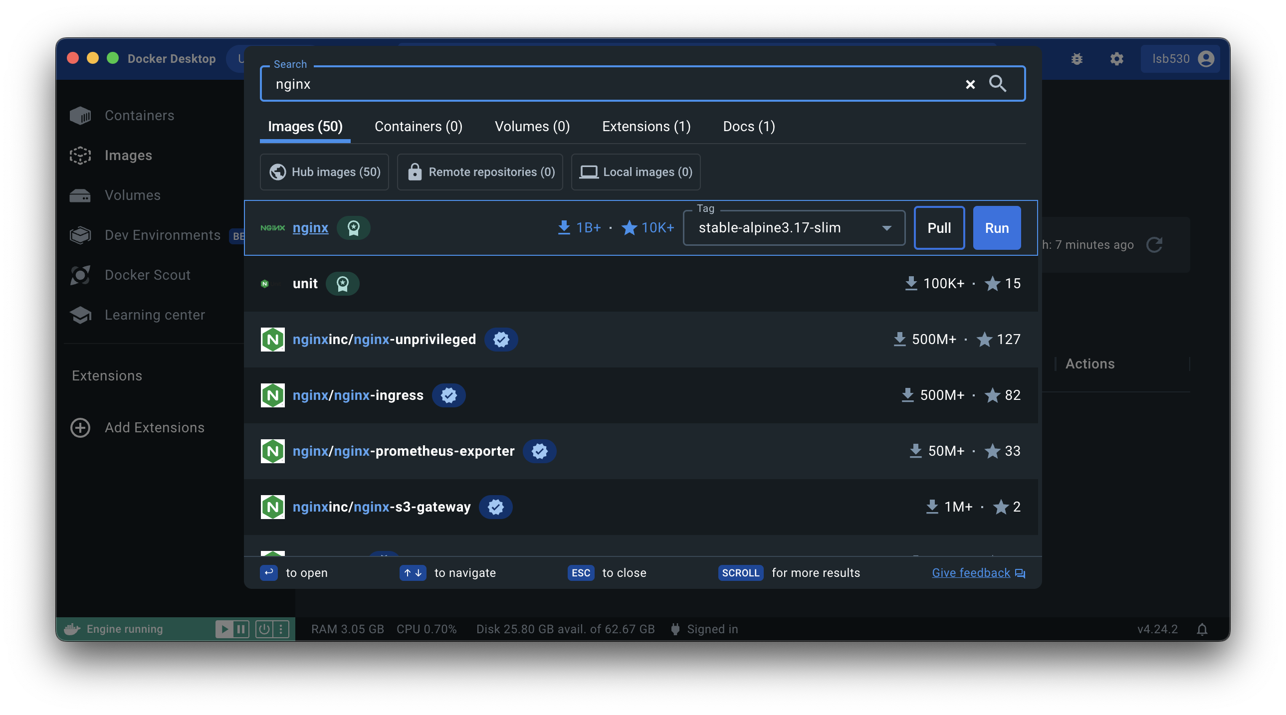 nginx의 이미지, 컨테이너, 볼륨, 확장프로그램, 문서 등을 검색하고 다운받을 수 있다