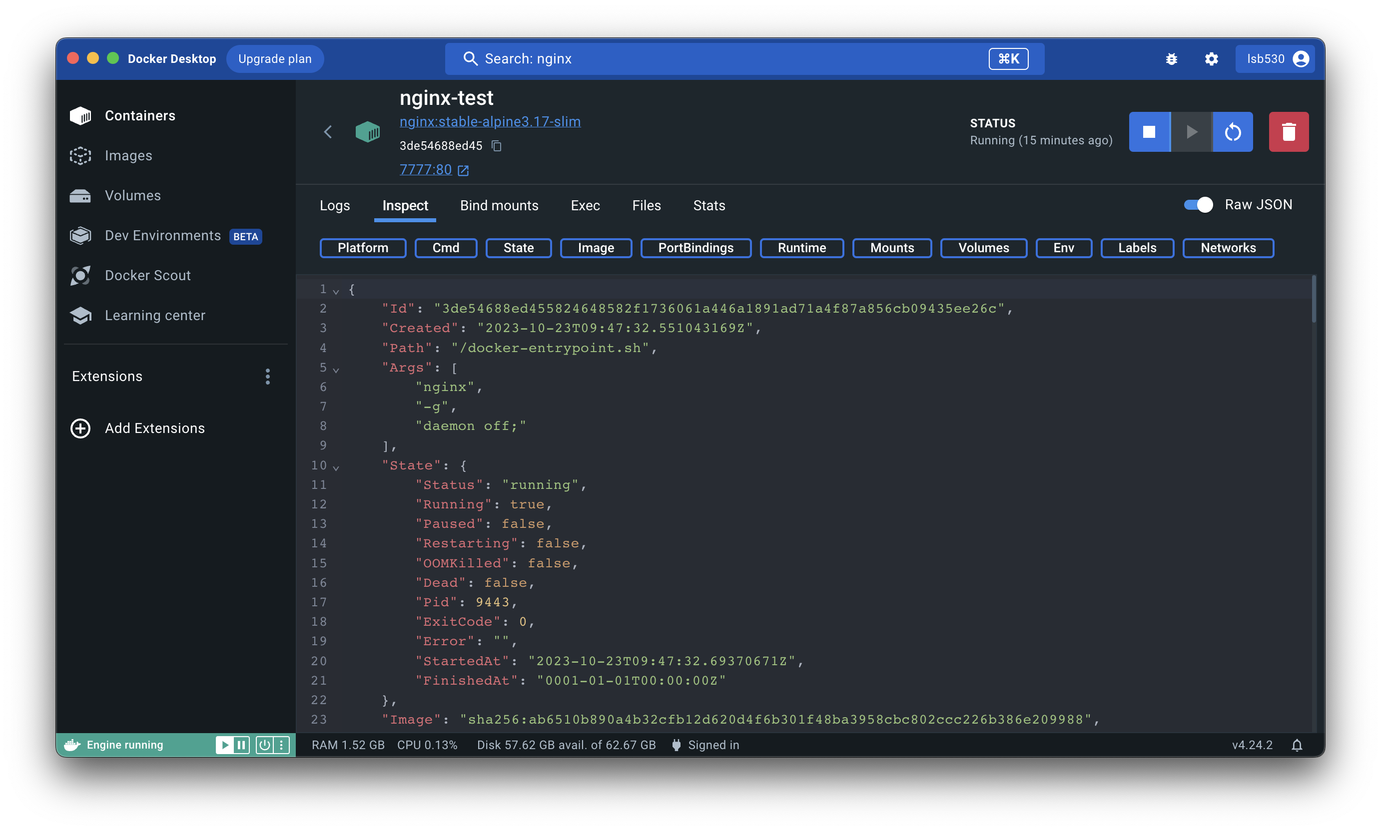Inspect 탭은 이 Dockerfile에 대한 세세한 정보를 볼 수 있게 해준다