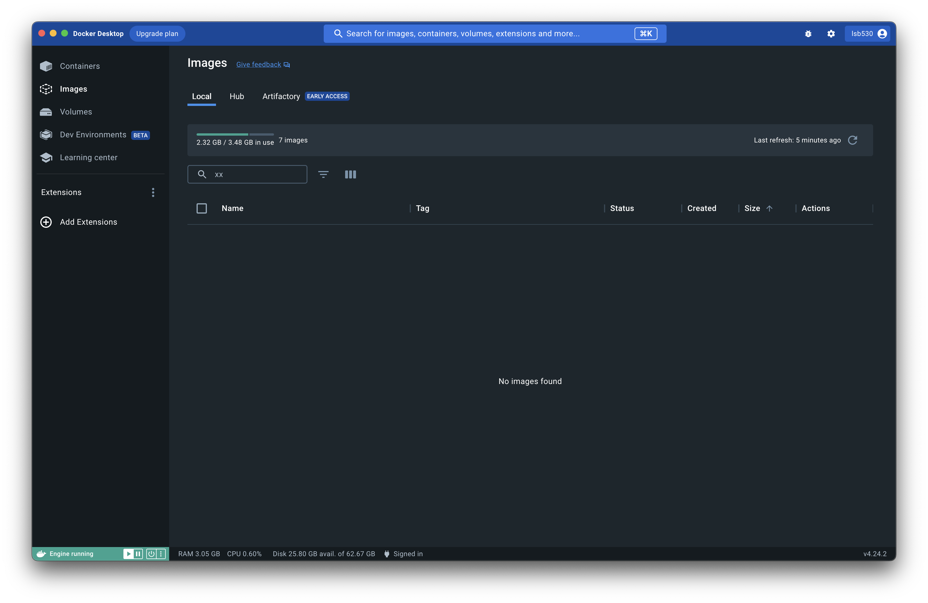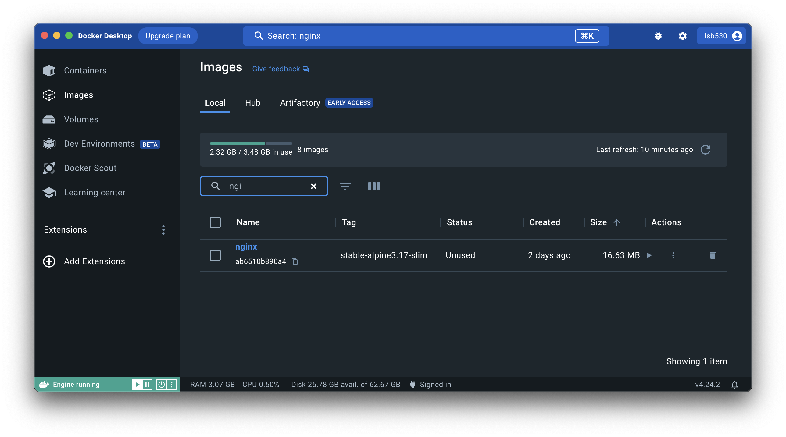 그리고 Images 탭을 누르면 도커로 받은 이미지들이 나온다