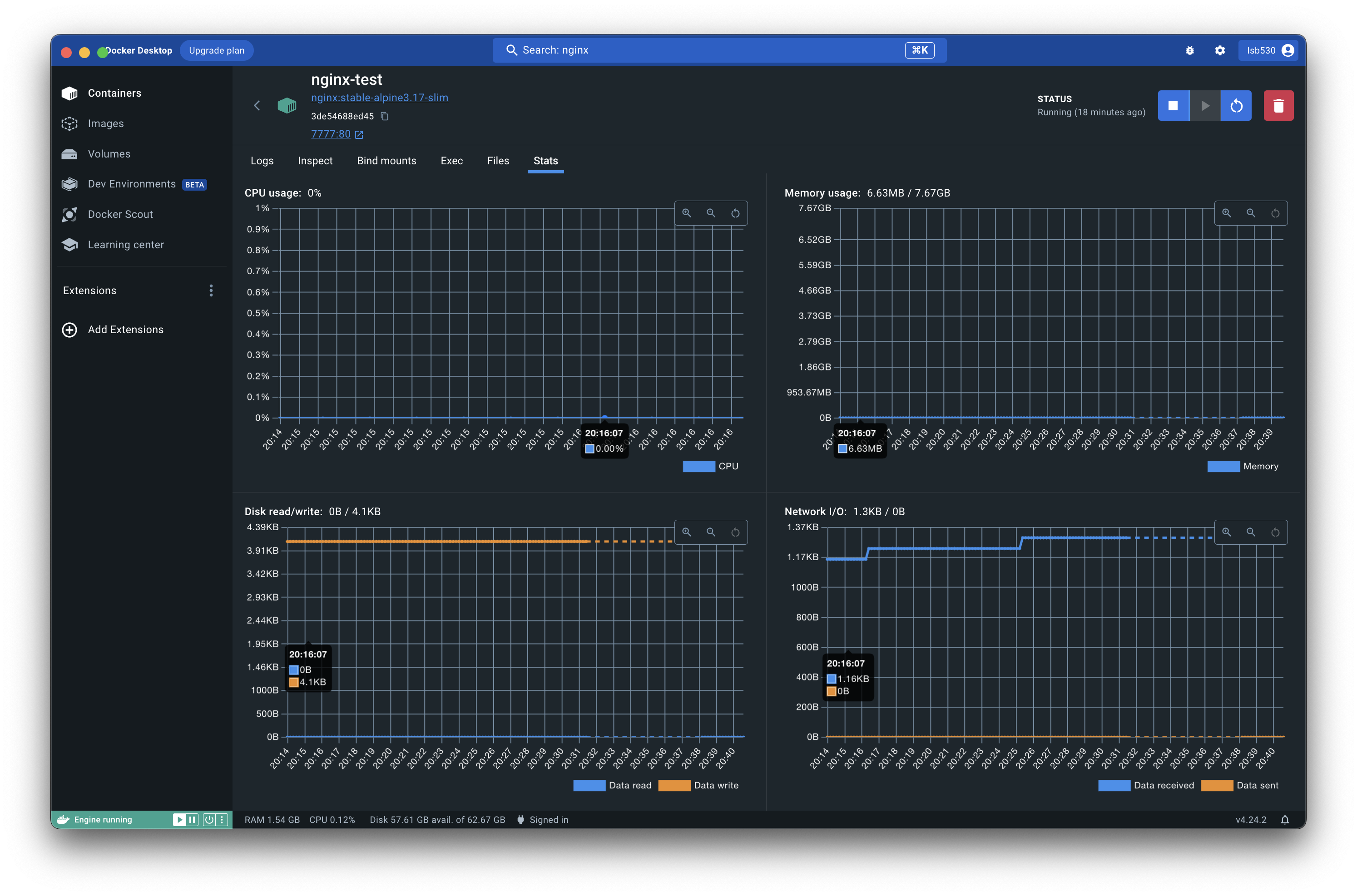 CPU, Memory, DISK I/O, Network I/O 사용량을 실시간 그래프로 확인할 수 있다