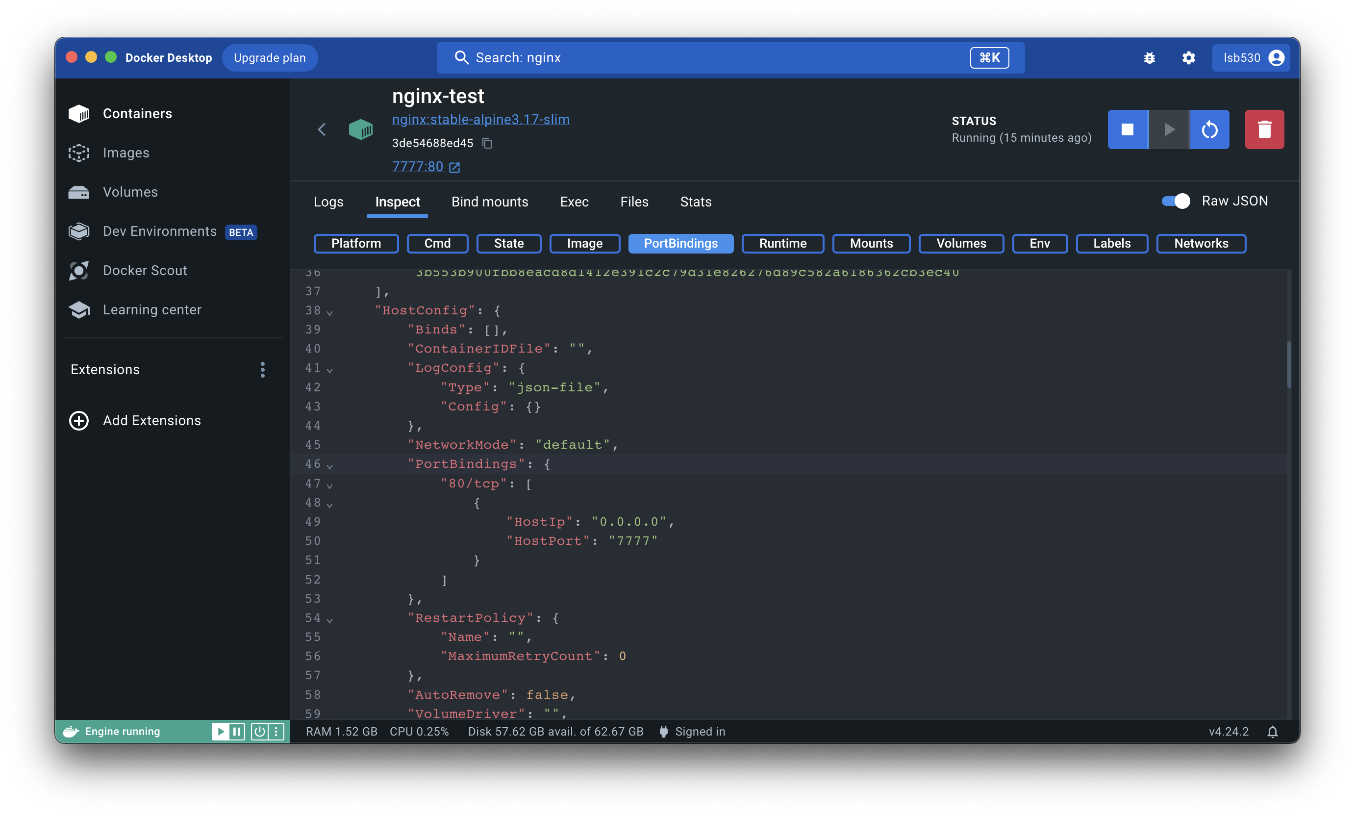 PortBindings를 클릭하면 실제로 어떻게 작성이 되었는지 볼 수 있다