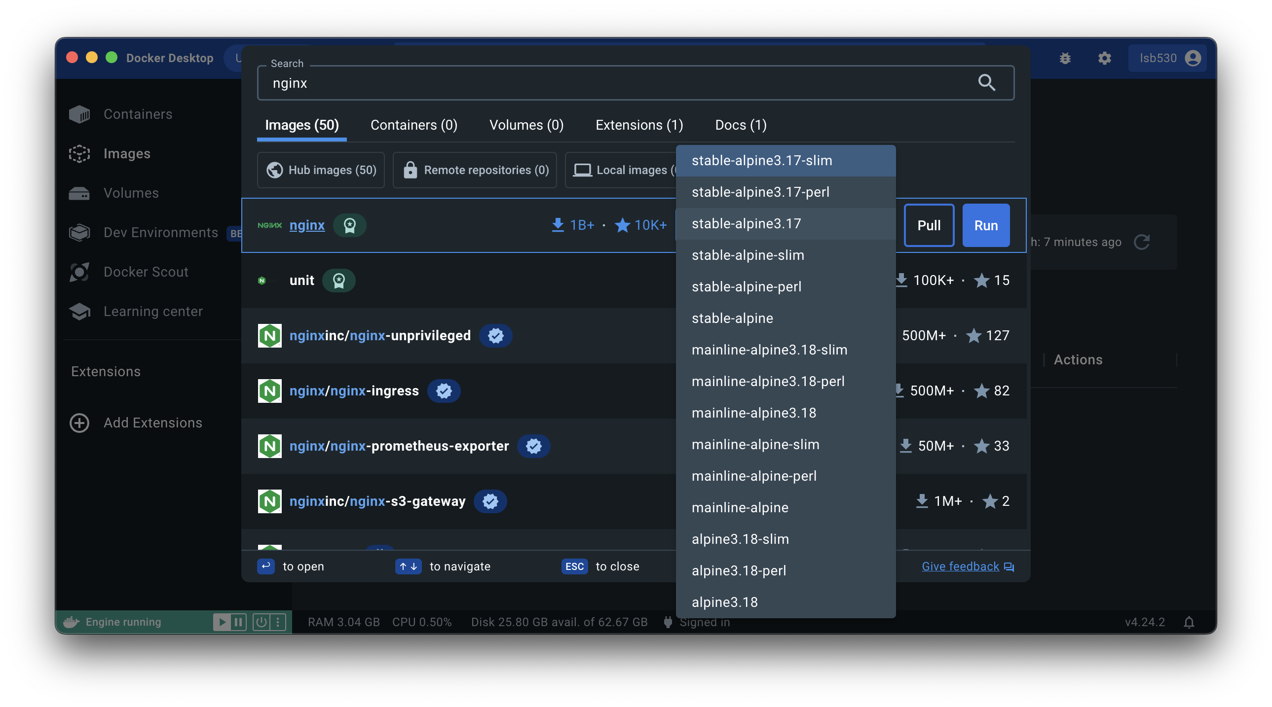nginx의 이미지, 컨테이너, 볼륨, 확장프로그램, 문서 등을 검색하고 다운받을 수 있다