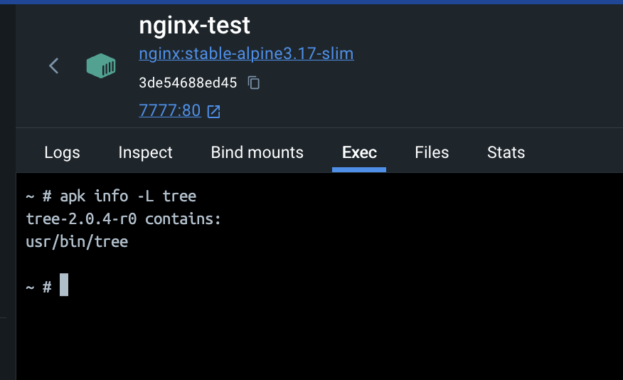 이번에는 Exec 탭을 클릭해보자 이 컨테이너의 내부로 들어와서 명령어들을 실행할 수 있게 된다