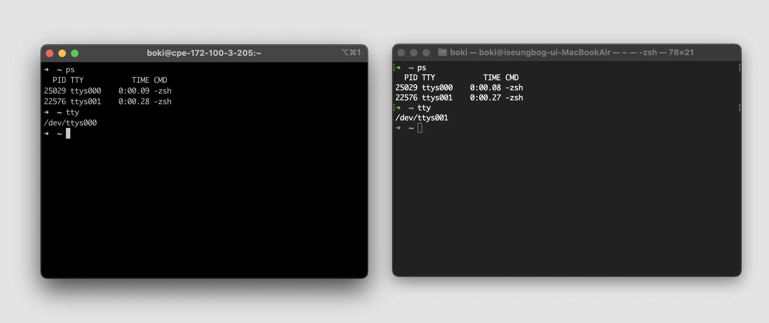 ps명령어와 tty명령어로 현재 두개의 프로세스(터미널 2개)를 띄워둔 상태이다