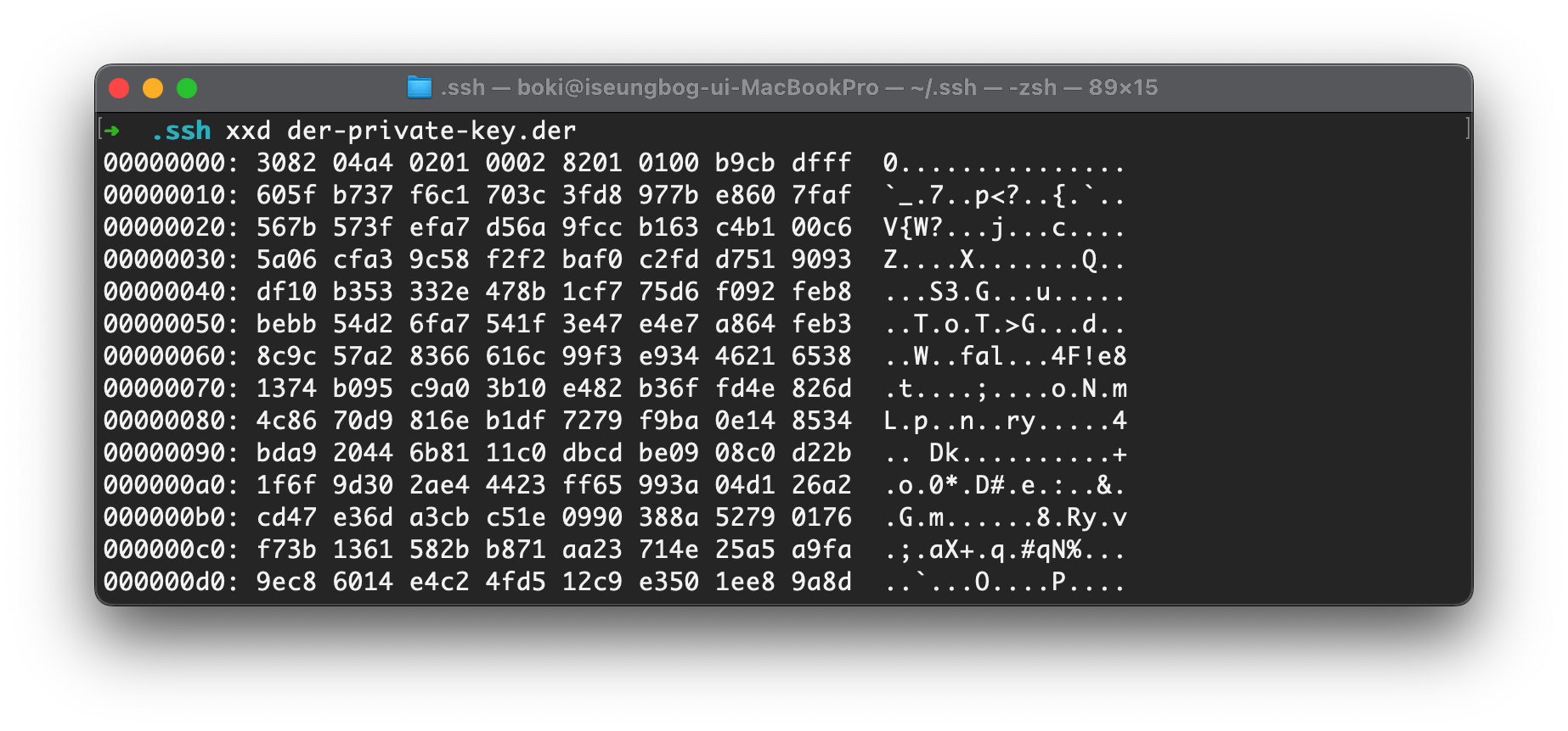 - 공개키는 Base64 인코딩으로 저장되고, 개인키는 ASN.1(Abstract Syntax Notation One) 형식으로 저장된다