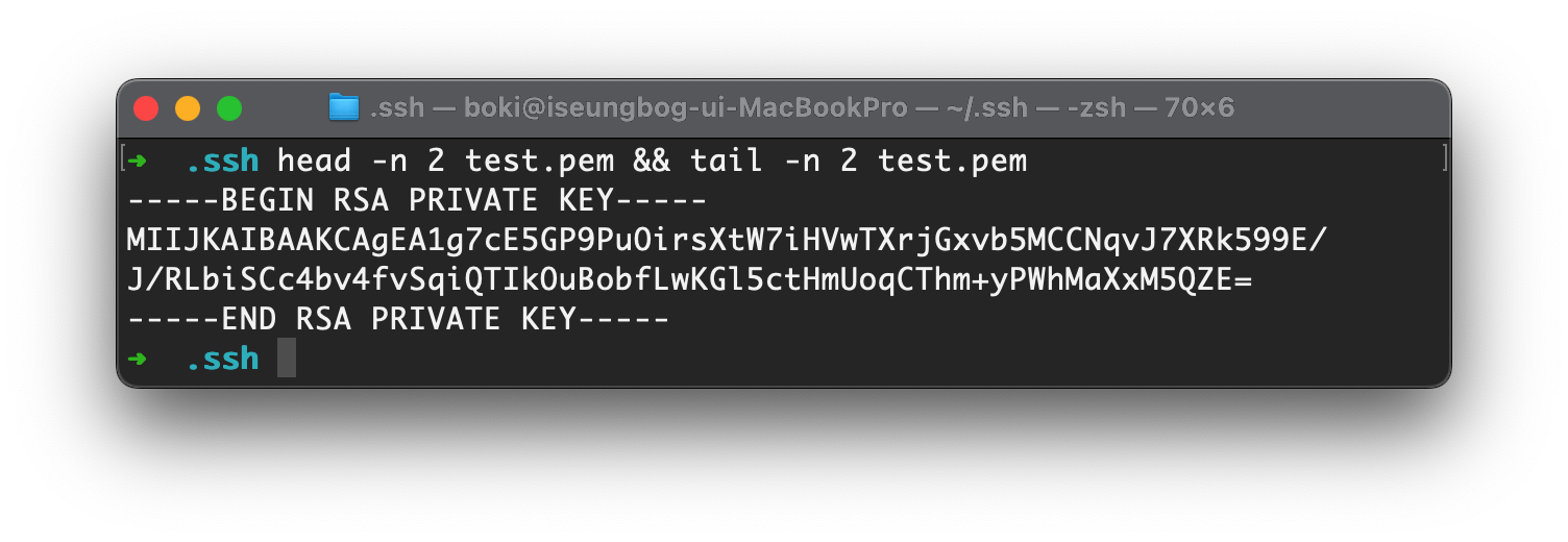 - PPK파일에는 공개키와 개인키가 같이 쓰여있으며, 메타데이터를 cat 명령어 등으로 읽어볼 수 있다