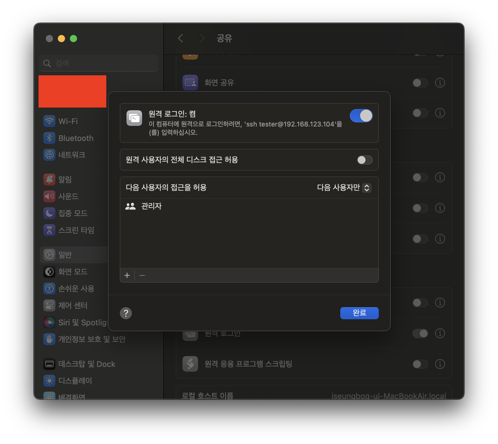 접속할 맥북(SSH 서버) - 192.168.123.104