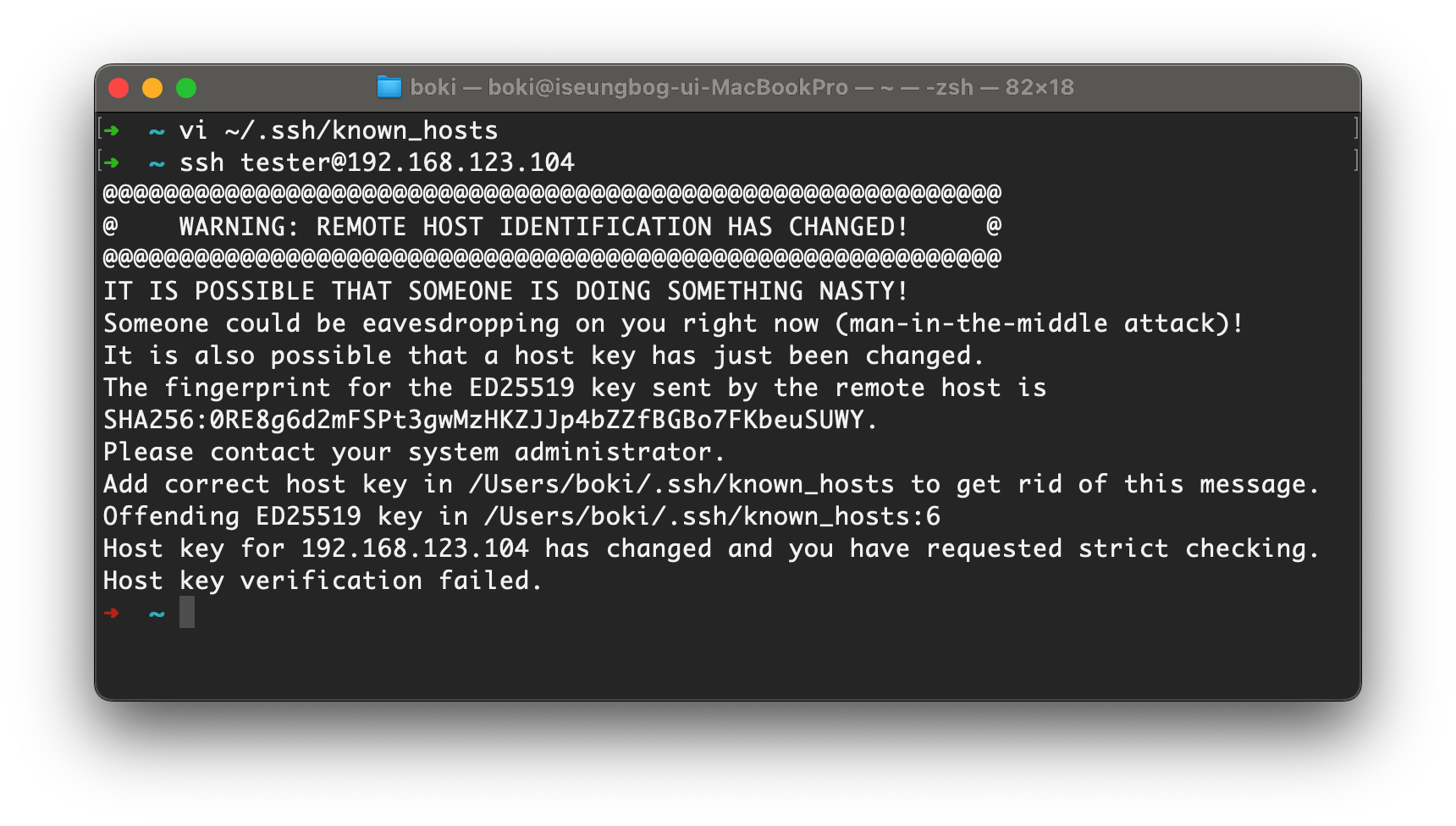 2. ssh로 접속을 하려하는데 known_hosts 파일에 쓰인 공개키가 다른 경우 어떻게 되는가?(MITM[중간자 공격] - Man In The Middle 테스트)