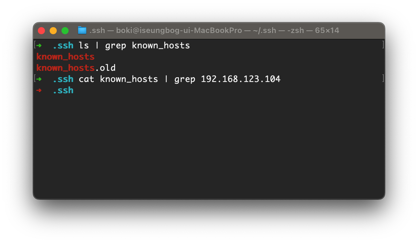 ssh 숨김폴더로 이동해서 known_hosts 파일 존재유무 확인 및 192.168.123.104 ip가 쓰여있는지 확인