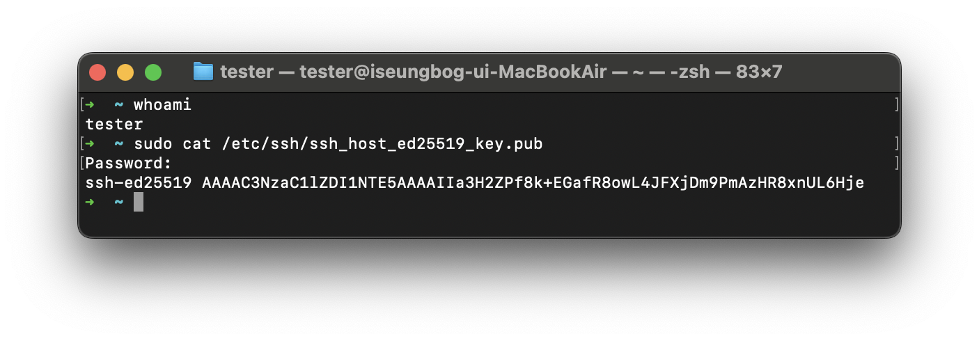 아까와 다르게 ssh-ed25519 key 알고리즘으로 어떤 값이 적힌 것을 볼 수 있다(SSH로 접속할 서버의 공개키)