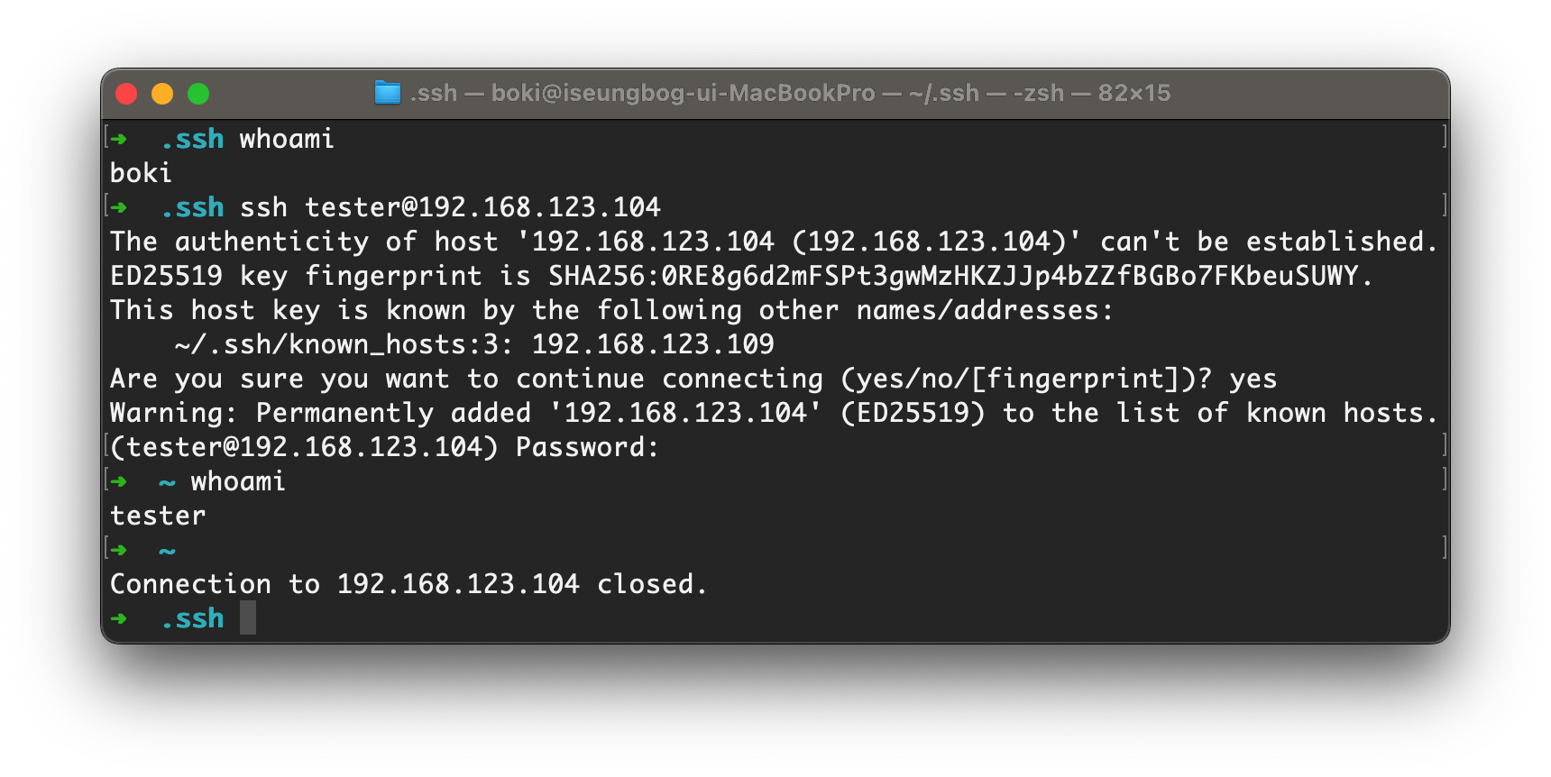 ssh 숨김폴더로 이동해서 known_hosts 파일 존재유무 확인 및 192.168.123.104 ip가 쓰여있는지 확인