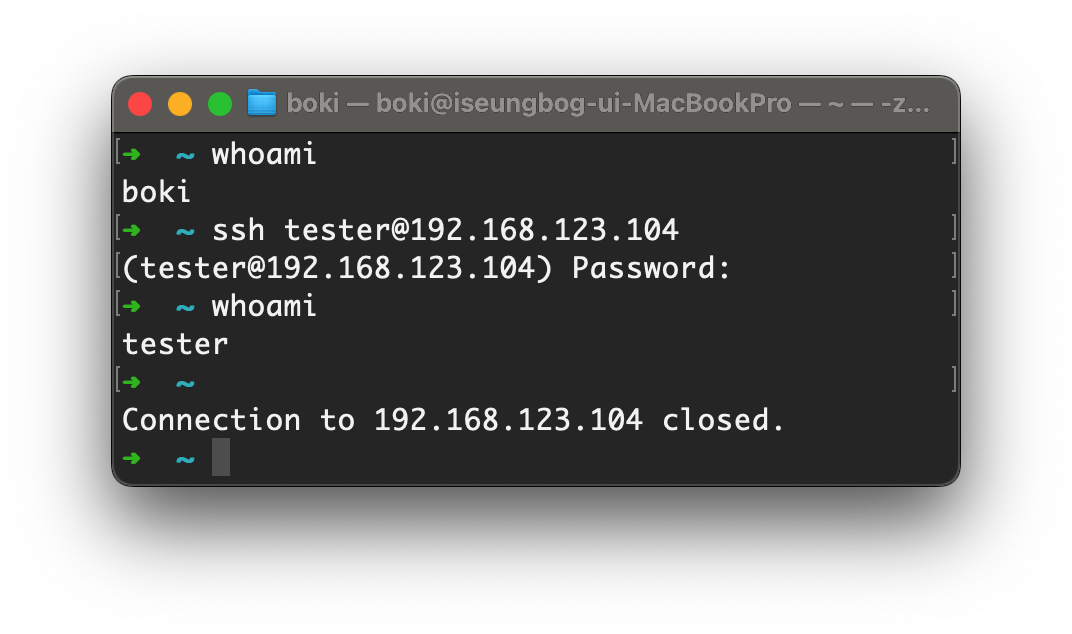 whoami 명령어로 현재 사용자 확인