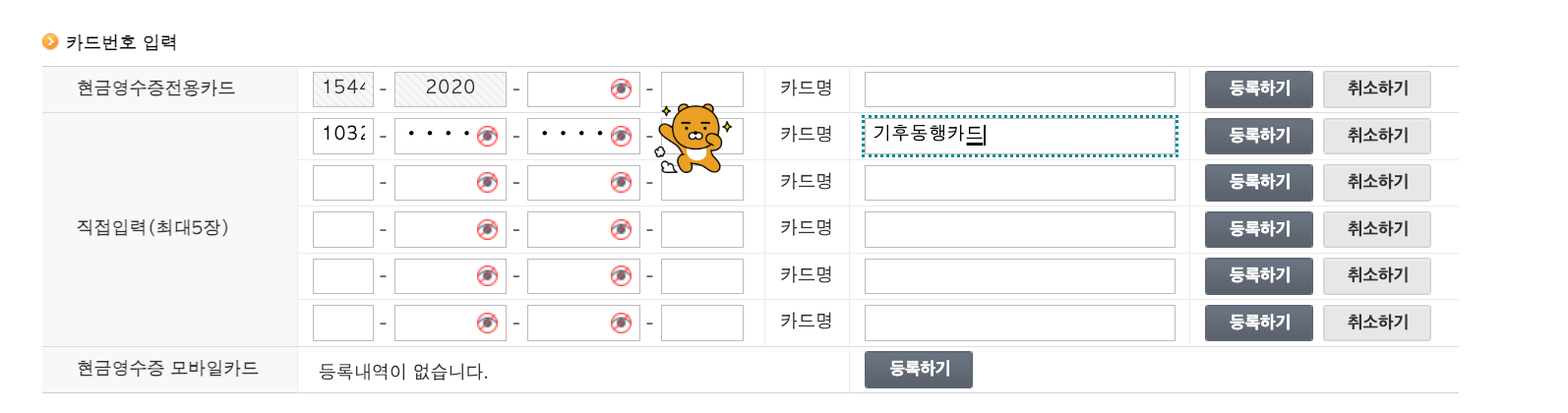 카드등록 바로가기를 누르면.. 아래의 화면을 볼 수 있다 ㅡㅡㅋ