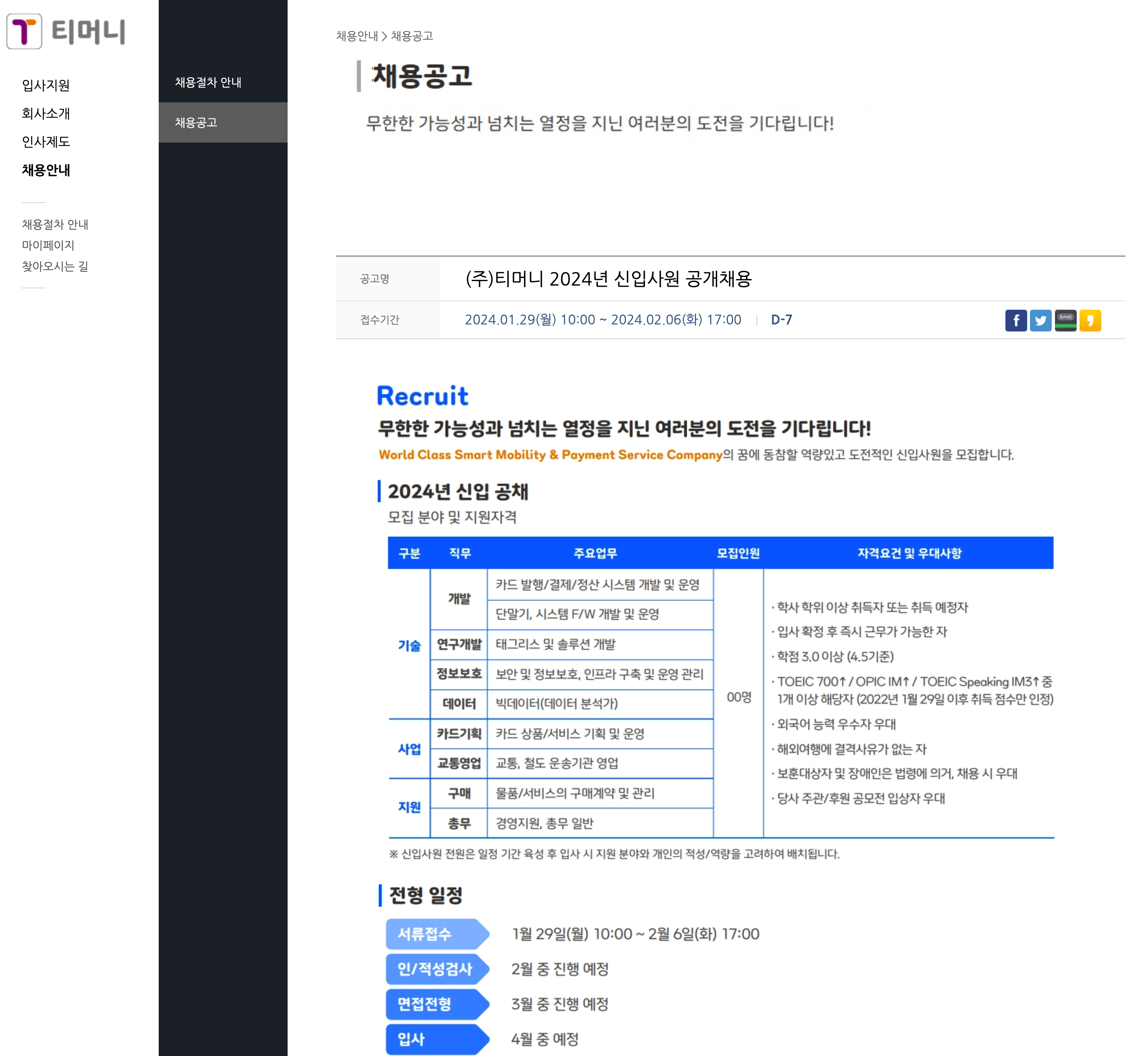 티머니 채용 공고에 보면 2024년 올해 새로 올라온 신입 공고가 있는것을 볼 수 있다..!!
