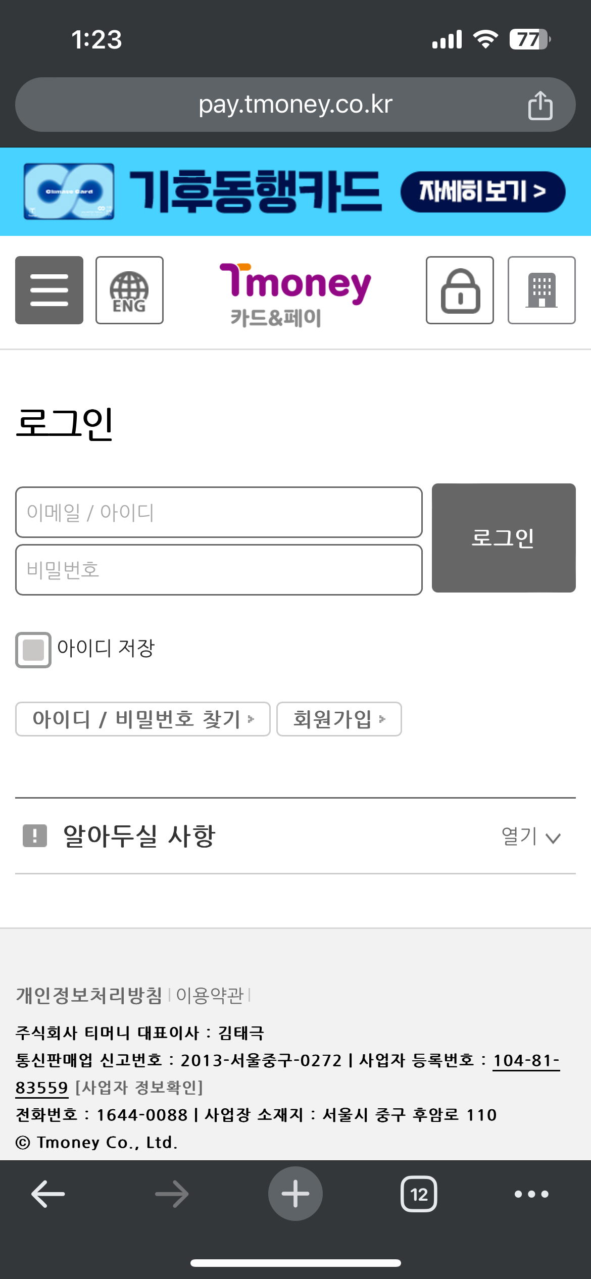 이제 카드 등록도 마쳤겠다...!! 카드에 돈을 충전하러 나왔다