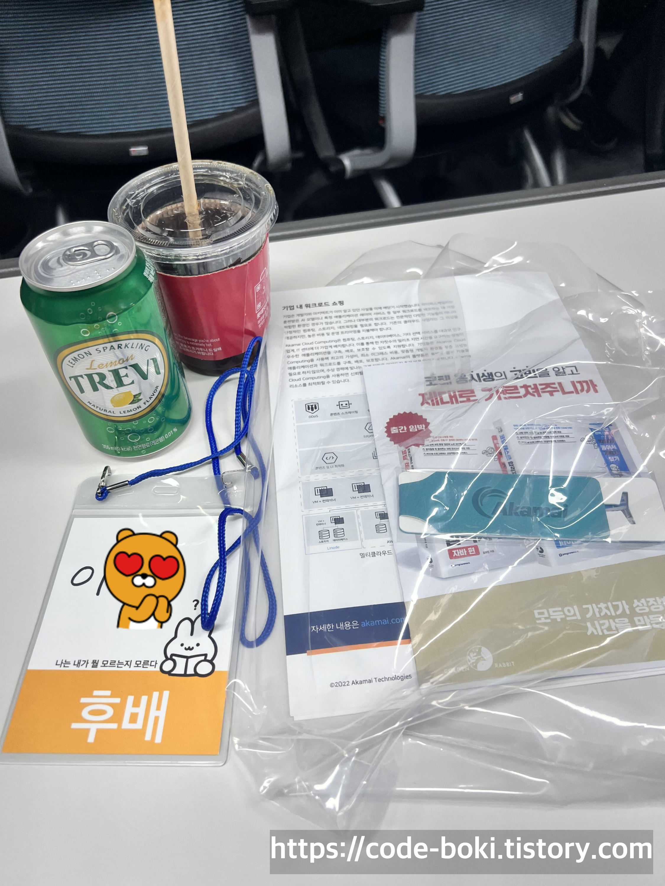 이름이 적혀진 목걸이(?), 아카마이 회사 홍보지, 아카마이 북클립(북마커), 골든래빗의 귀여운 스티커가 붙여진 음료수를 받았다